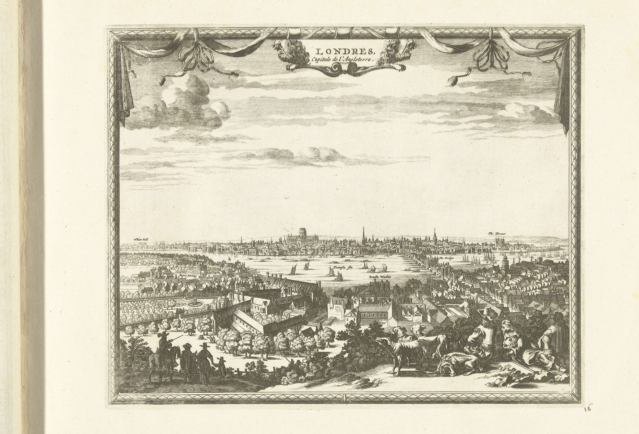 Gezicht op Londen, gezien vanaf de zuidzijde van de Theems. Plaat nr. 16 in deel I van het prentwerk: Les Forces de l'Europe, Asie, Afrique et Amerique ... Comme aussi les Cartes des Côtes de France et d'Espagne uit 1726, dit eerste deel met 238 met de hand genummerde platen van vermaarde sterke steden en ...