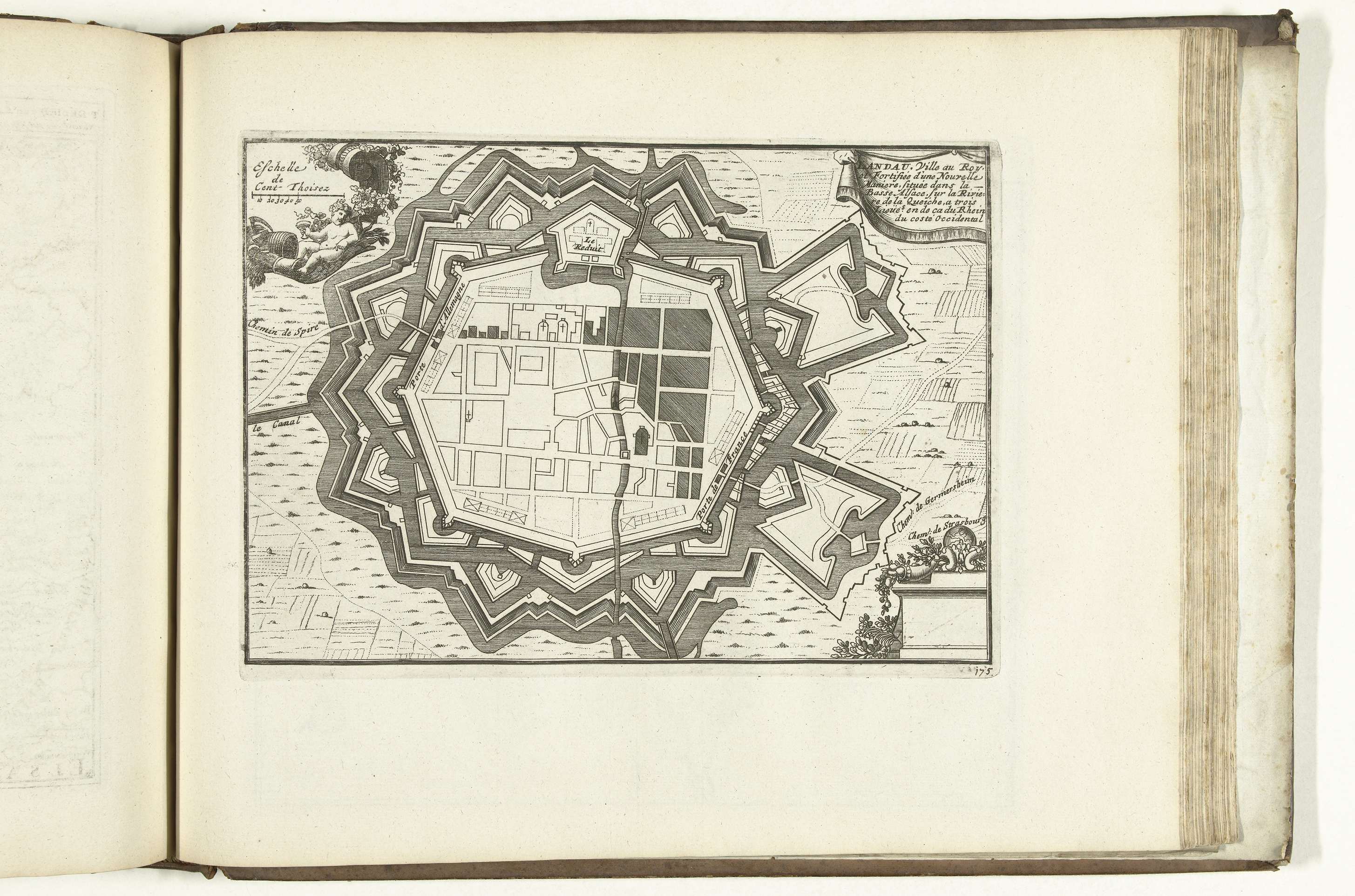 Plattegrond van de versterkingen rond de Duitse stad Landau in der Pfalz. Plaat nr. 175 in deel VIII van het prentwerk: Les Forces de l'Europe, Asie, Afrique et Amerique ... Comme aussi les Cartes des Côtes de France et d'Espagne uit 1726, dit eerste deel met 238 met de hand genummerde platen van vermaarde sterke ...