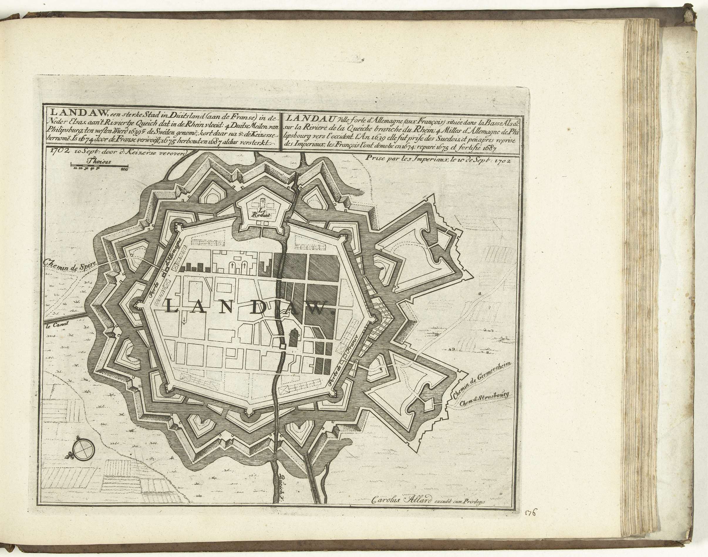 Plattegrond van de stad Landau, veroverd op de Fransen door de keizerlijke troepen op 10 september 1702. Plaat nr. 176 in deel VIII van het prentwerk: Les Forces de l'Europe, Asie, Afrique et Amerique ... Comme aussi les Cartes des Côtes de France et d'Espagne uit 1726, dit eerste deel met 238 met de hand ...