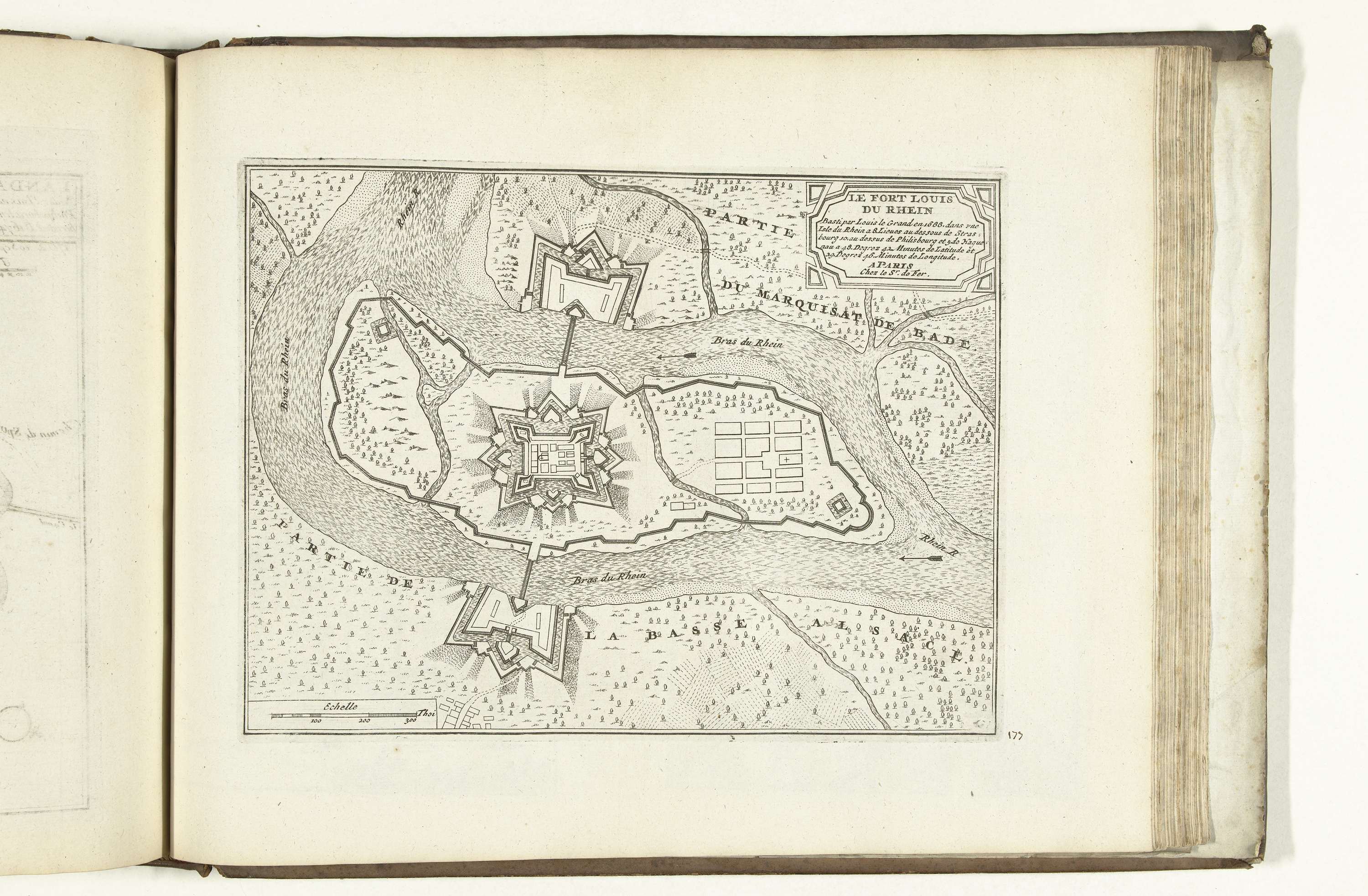 Plattegrond van het in 1688 door de Fransen gebouwde Fort Louis, gelegen aan de Rijn onder Straatsburg. Plaat nr. 177 in deel VIII van het prentwerk: Les Forces de l'Europe, Asie, Afrique et Amerique ... Comme aussi les Cartes des Côtes de France et d'Espagne uit 1726, dit eerste deel met 238 met de hand ...