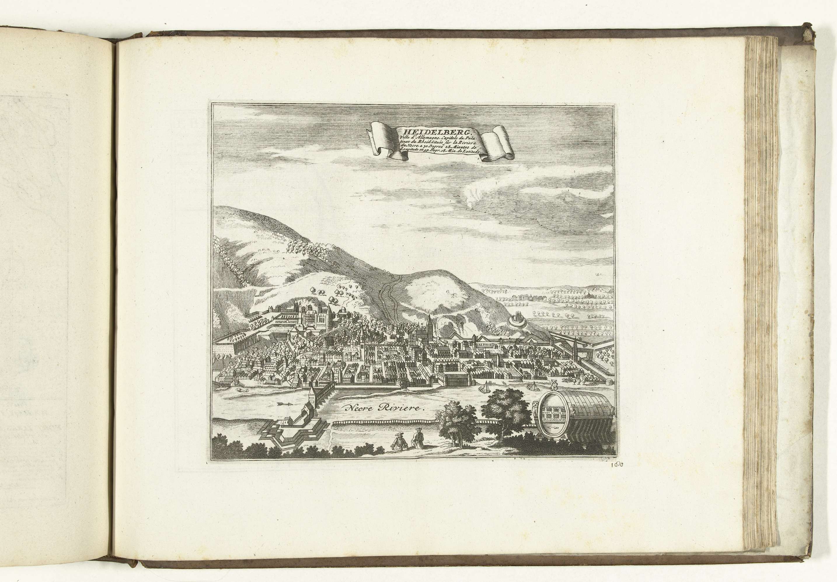 Gezicht op de Duitse stad Heidelberg, op de voorgrond het grote vat. Plaat nr. 180 in deel VIII van het prentwerk: Les Forces de l'Europe, Asie, Afrique et Amerique ... Comme aussi les Cartes des Côtes de France et d'Espagne uit 1726, dit eerste deel met 238 met de hand genummerde platen van vermaarde sterke ...