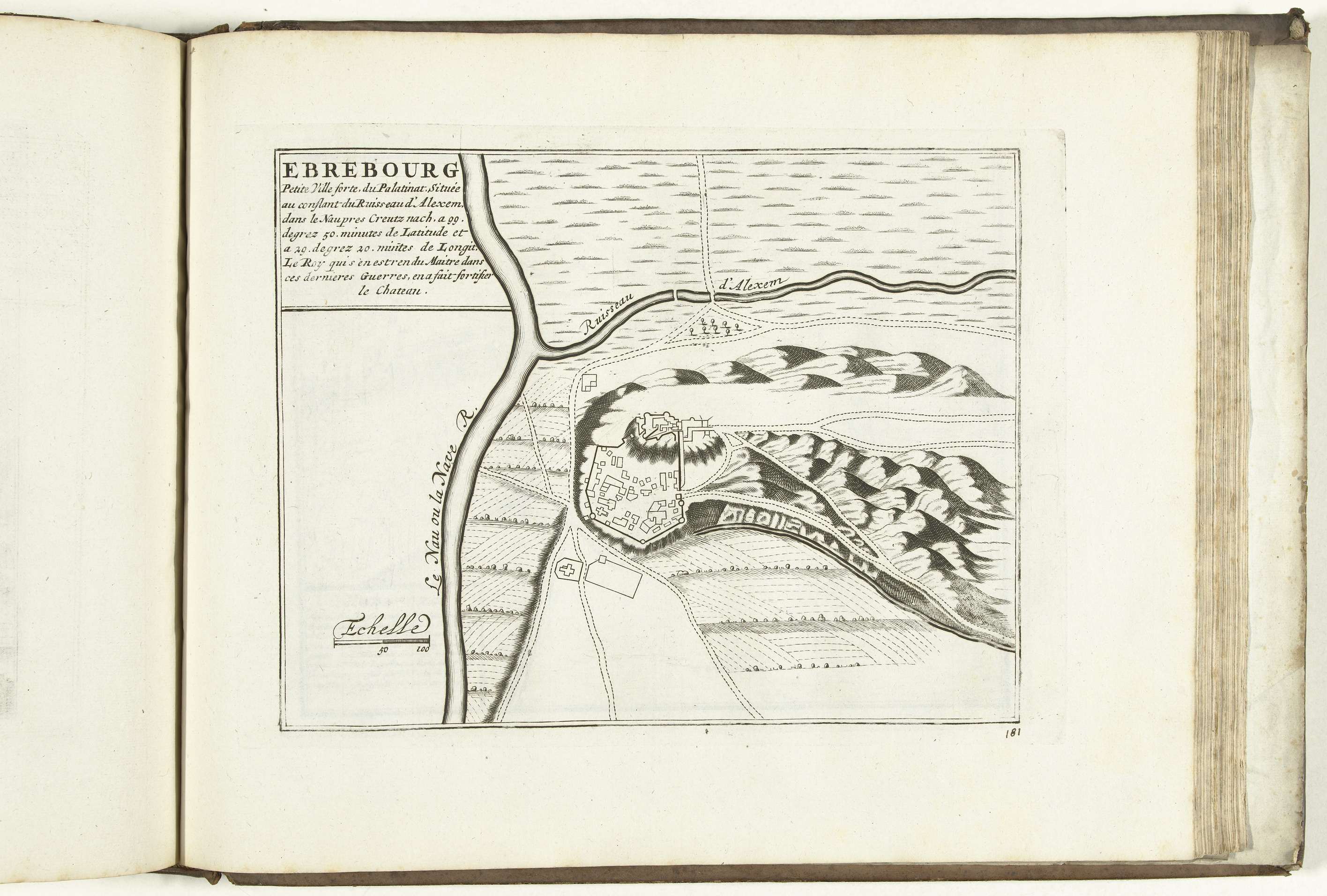 Plattegrond van de versterkingen om het plaatsje Ebrébourg in Rheinland-Pfalz. Plaat nr. 181 in deel VIII van het prentwerk: Les Forces de l'Europe, Asie, Afrique et Amerique ... Comme aussi les Cartes des Côtes de France et d'Espagne uit 1726, dit eerste deel met 238 met de hand genummerde platen van vermaarde sterke steden en ...