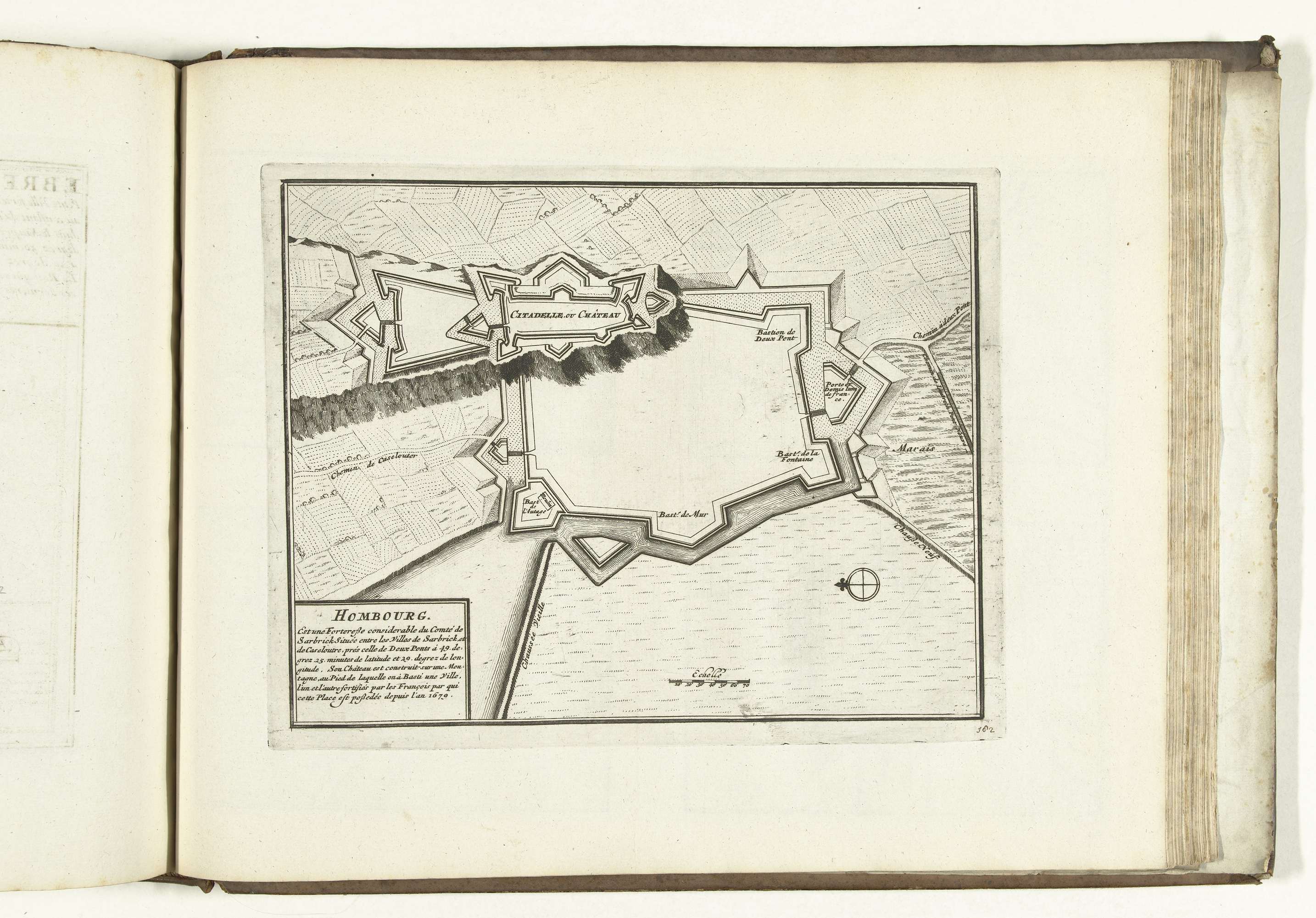 Plattegrond van de versterkingen om de Duitse stad Homburg. Plaat nr. 182 in deel VIII van het prentwerk: Les Forces de l'Europe, Asie, Afrique et Amerique ... Comme aussi les Cartes des Côtes de France et d'Espagne uit 1726, dit eerste deel met 238 met de hand genummerde platen van vermaarde sterke steden en vestingen ...