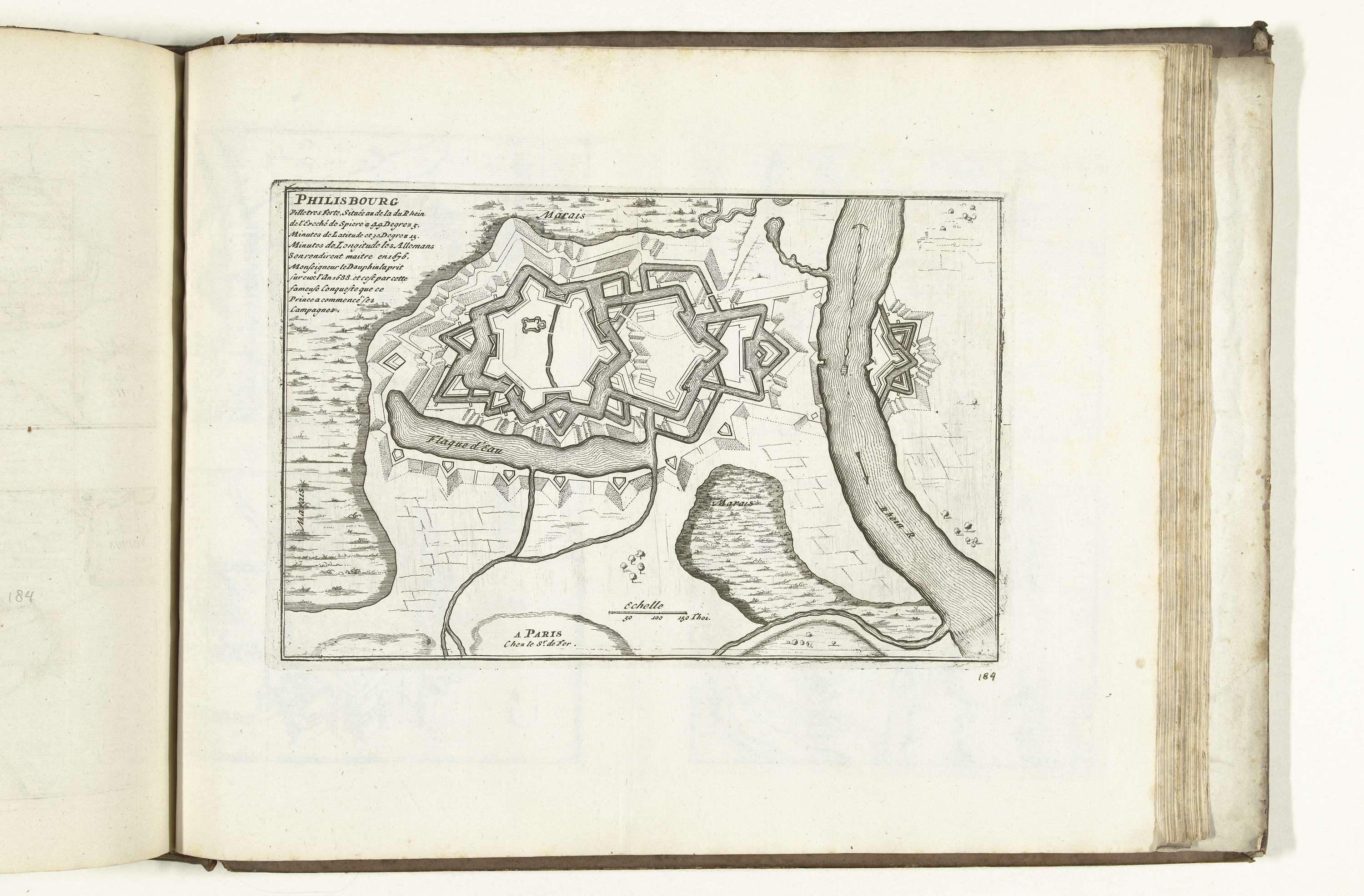 Plattegrond van de versterkingen om de plaats Philippsburg. Plaat nr. 184 in deel VIII van het prentwerk: Les Forces de l'Europe, Asie, Afrique et Amerique ... Comme aussi les Cartes des Côtes de France et d'Espagne uit 1726, dit eerste deel met 238 met de hand genummerde platen van vermaarde sterke steden en vestingen in ...