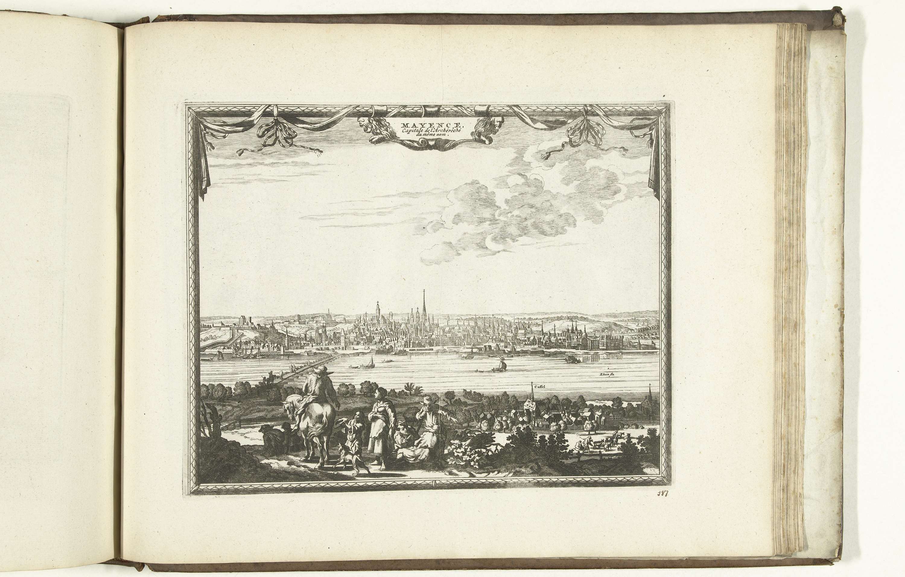 Gezicht op de stad Mainz. Op de voorgrond bedelt een jongen bij een ruiter. Plaat nr. 187 in deel VIII van het prentwerk: Les Forces de l'Europe, Asie, Afrique et Amerique ... Comme aussi les Cartes des Côtes de France et d'Espagne uit 1726, dit eerste deel met 238 met de hand genummerde platen van ...