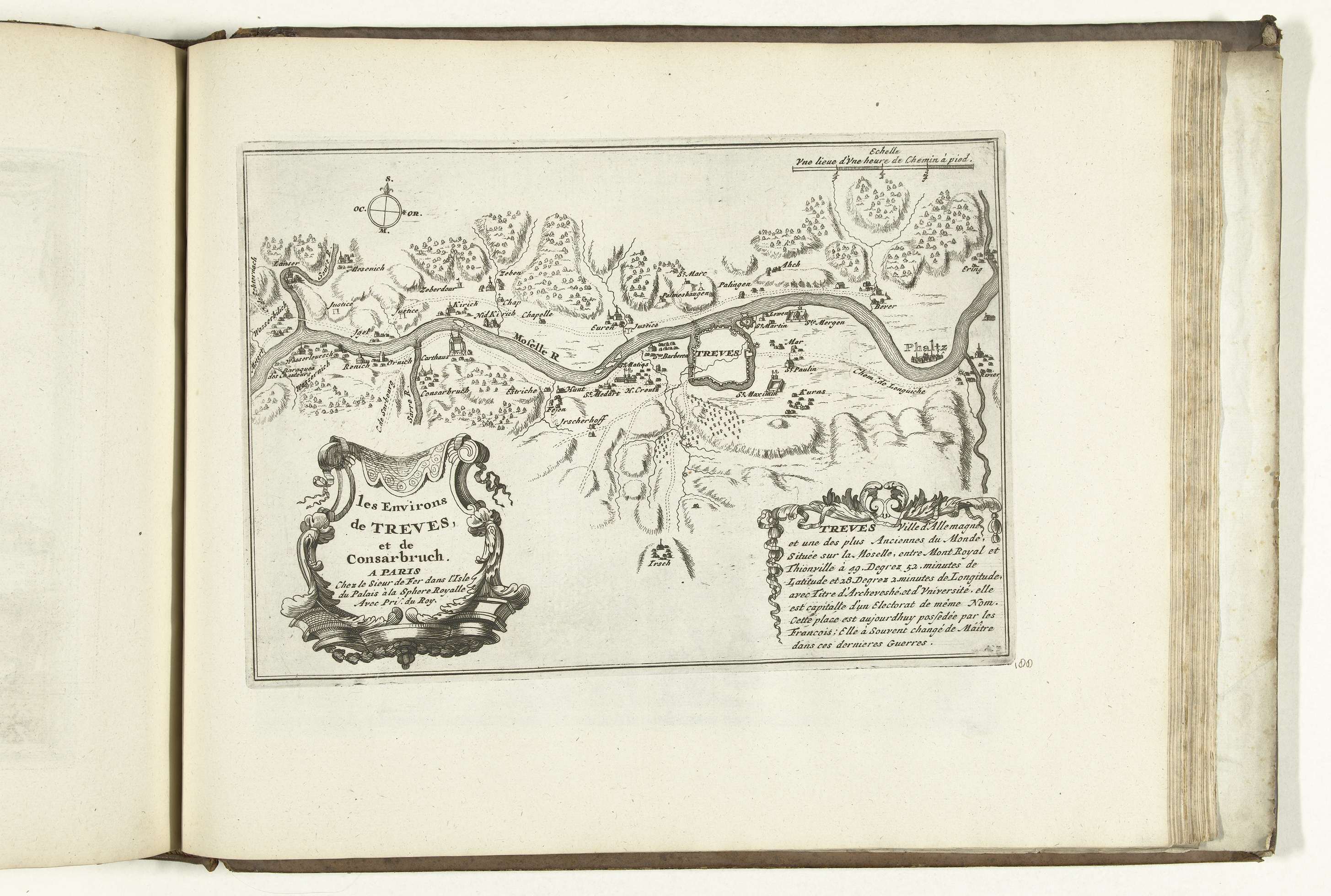 Kaart van de omgeving tussen Trier en Saarburg aan de Mosel. Plaat nr. 188 in deel VIII van het prentwerk: Les Forces de l'Europe, Asie, Afrique et Amerique ... Comme aussi les Cartes des Côtes de France et d'Espagne uit 1726, dit eerste deel met 238 met de hand genummerde platen van vermaarde sterke steden ...
