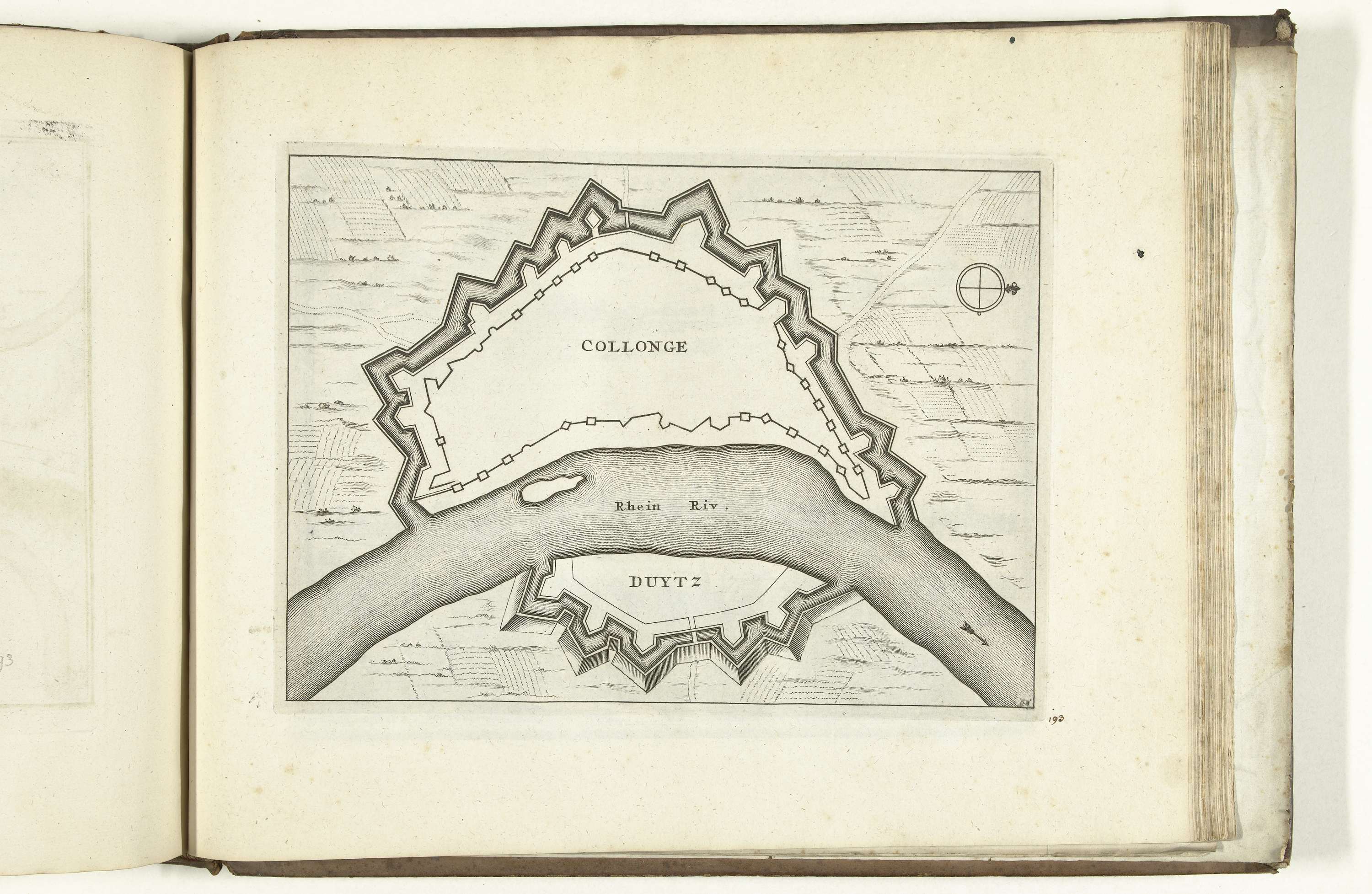 Plattegrond van de verdedigingswerken om Keulen. Plaat nr. 193 in deel VIII van het prentwerk: Les Forces de l'Europe, Asie, Afrique et Amerique ... Comme aussi les Cartes des Côtes de France et d'Espagne uit 1726, dit eerste deel met 238 met de hand genummerde platen van vermaarde sterke steden en vestingen in het kader ...