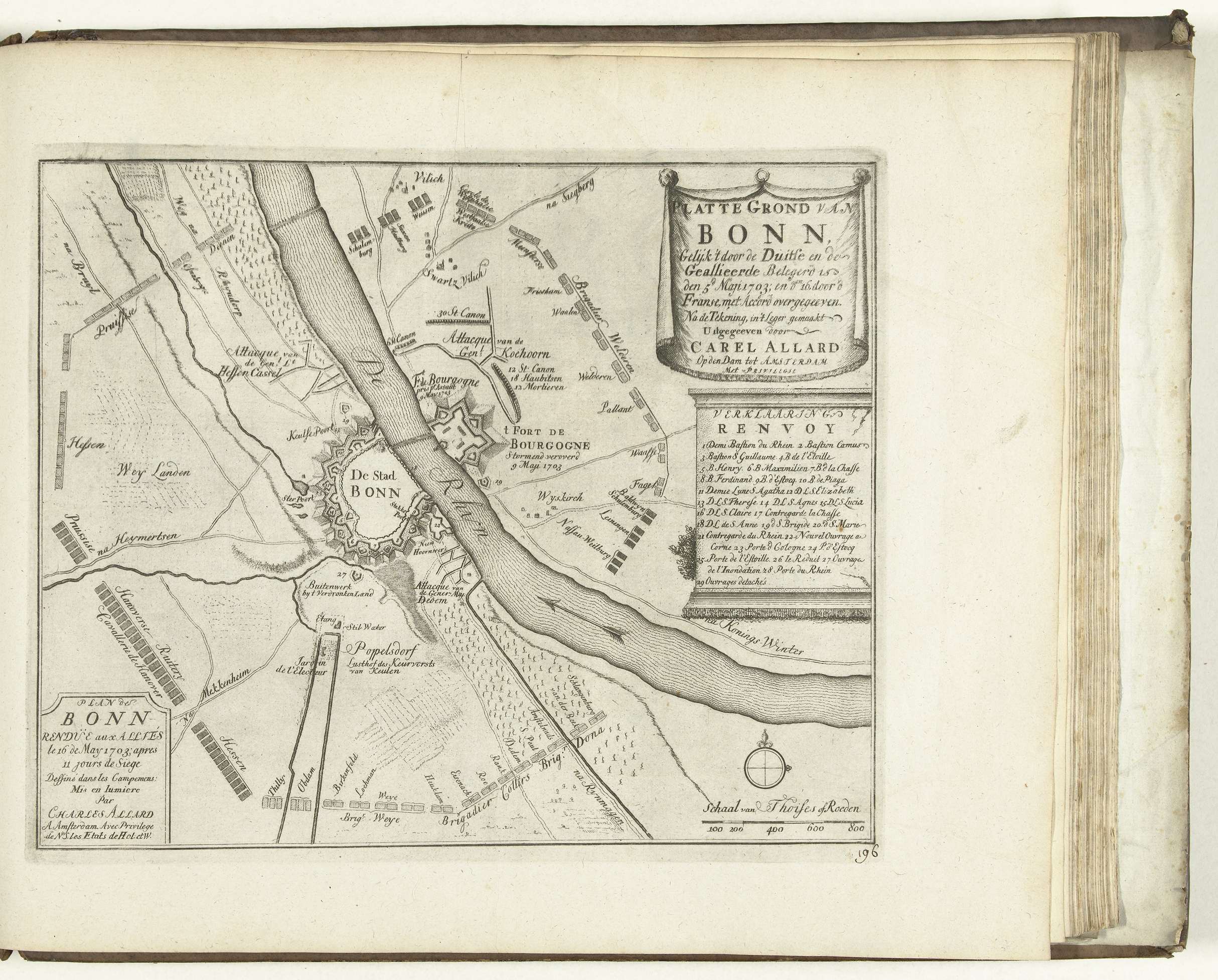 Belegering van de Duitse stad Bonn door de geallieerden vanaf 5 mei en inname na overgave door de Fransen op 15 (of 16) mei 1703. Kaart met een plattegrond van de versterkingen om de stad en de posities van de belegerende troepen. Plaat nr. 196 in deel VIII van het prentwerk: Les Forces de l'Europe, ...