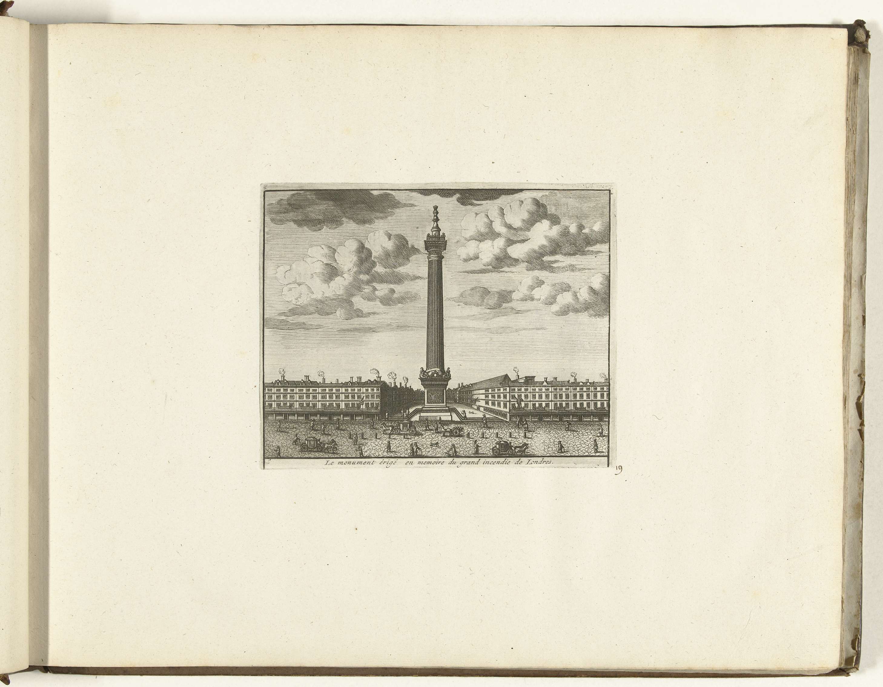 Het Monument voor de Grote Brand van Londen in 1666. Plaat nr. 19 in deel I van het prentwerk: Les Forces de l'Europe, Asie, Afrique et Amerique ... Comme aussi les Cartes des Côtes de France et d'Espagne uit 1726, dit eerste deel met 238 met de hand genummerde platen van vermaarde sterke steden en ...