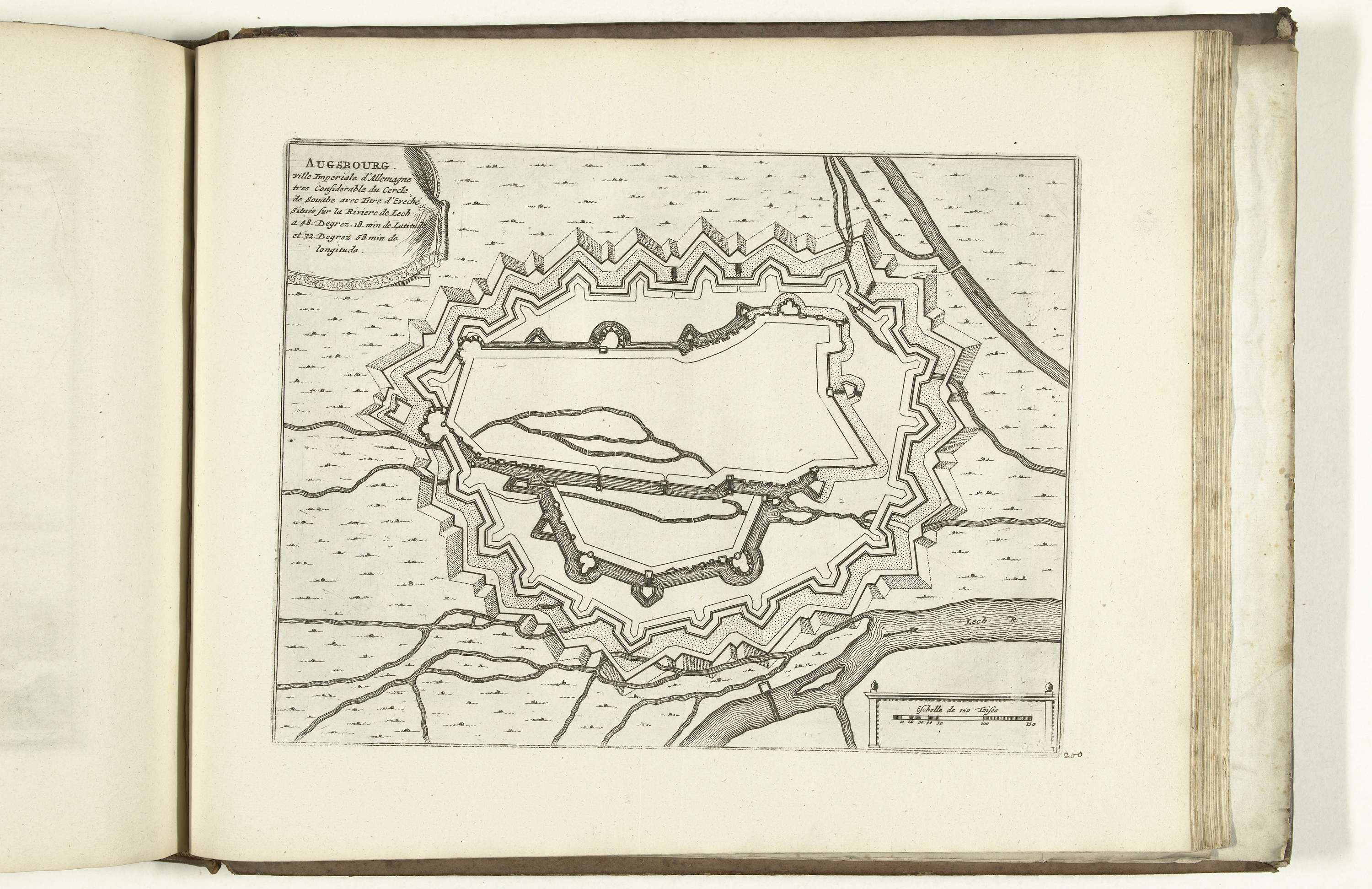 Plattegrond van de versterkingen om de stad Augsburg. Plaat nr. 200 in deel IX van het prentwerk: Les Forces de l'Europe, Asie, Afrique et Amerique ... Comme aussi les Cartes des Côtes de France et d'Espagne uit 1726, dit eerste deel met 238 met de hand genummerde platen van vermaarde sterke steden en vestingen in ...