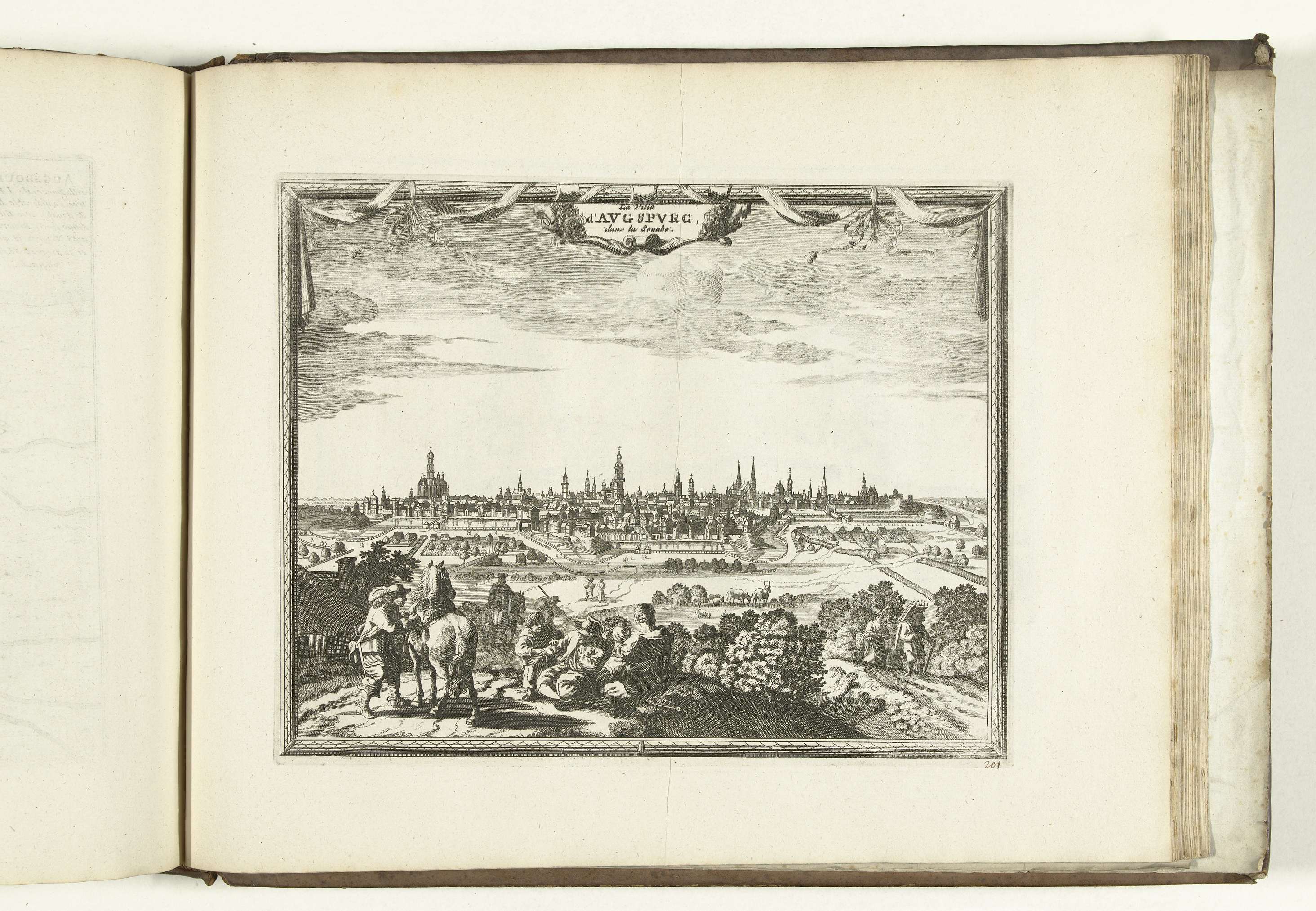 Gezicht op Augsburg, op de voorgrond rustende reizigers. Plaat nr. 201 in deel IX van het prentwerk: Les Forces de l'Europe, Asie, Afrique et Amerique ... Comme aussi les Cartes des Côtes de France et d'Espagne uit 1726, dit eerste deel met 238 met de hand genummerde platen van vermaarde sterke steden en vestingen in ...