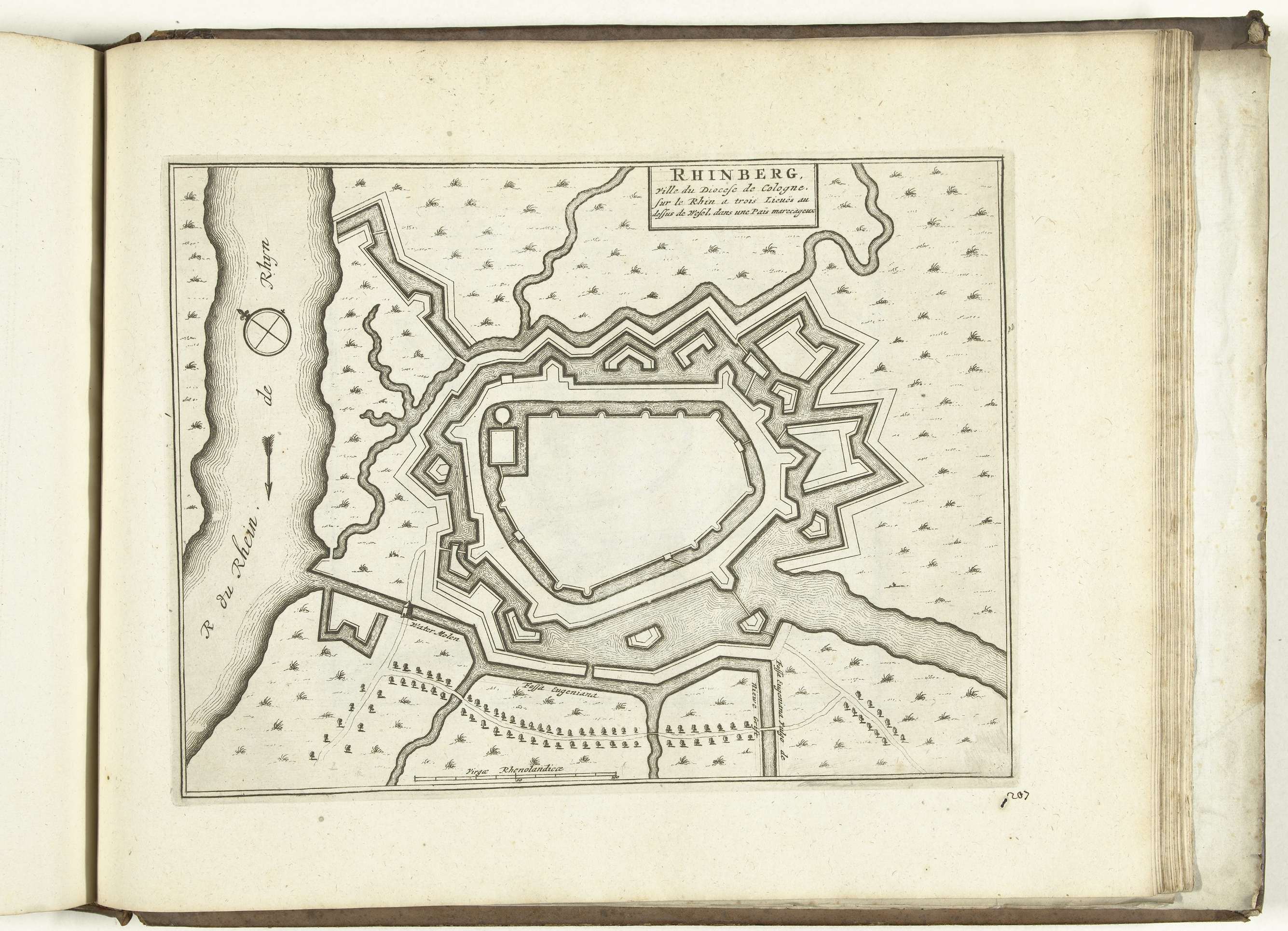 Plattegrond van de verdedigingswerken om de stad Rheinberg. Plaat nr. 207 in deel IX van het prentwerk: Les Forces de l'Europe, Asie, Afrique et Amerique ... Comme aussi les Cartes des Côtes de France et d'Espagne uit 1726, dit eerste deel met 238 met de hand genummerde platen van vermaarde sterke steden en vestingen in ...