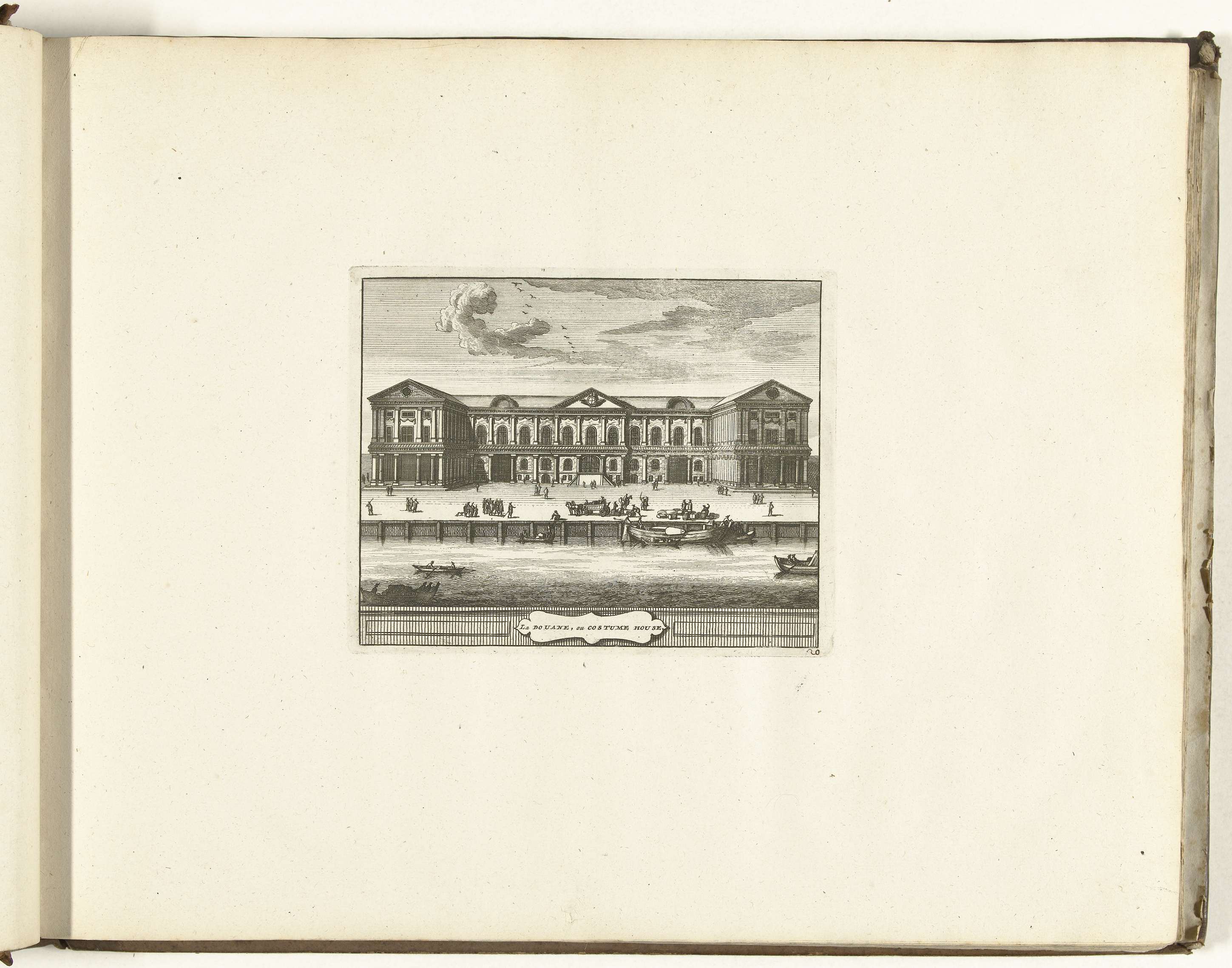 Gezicht op de Custom House aan de Theems in Londen. Plaat nr. 20 in deel I van het prentwerk: Les Forces de l'Europe, Asie, Afrique et Amerique ... Comme aussi les Cartes des Côtes de France et d'Espagne uit 1726, dit eerste deel met 238 met de hand genummerde platen van vermaarde sterke steden en ...