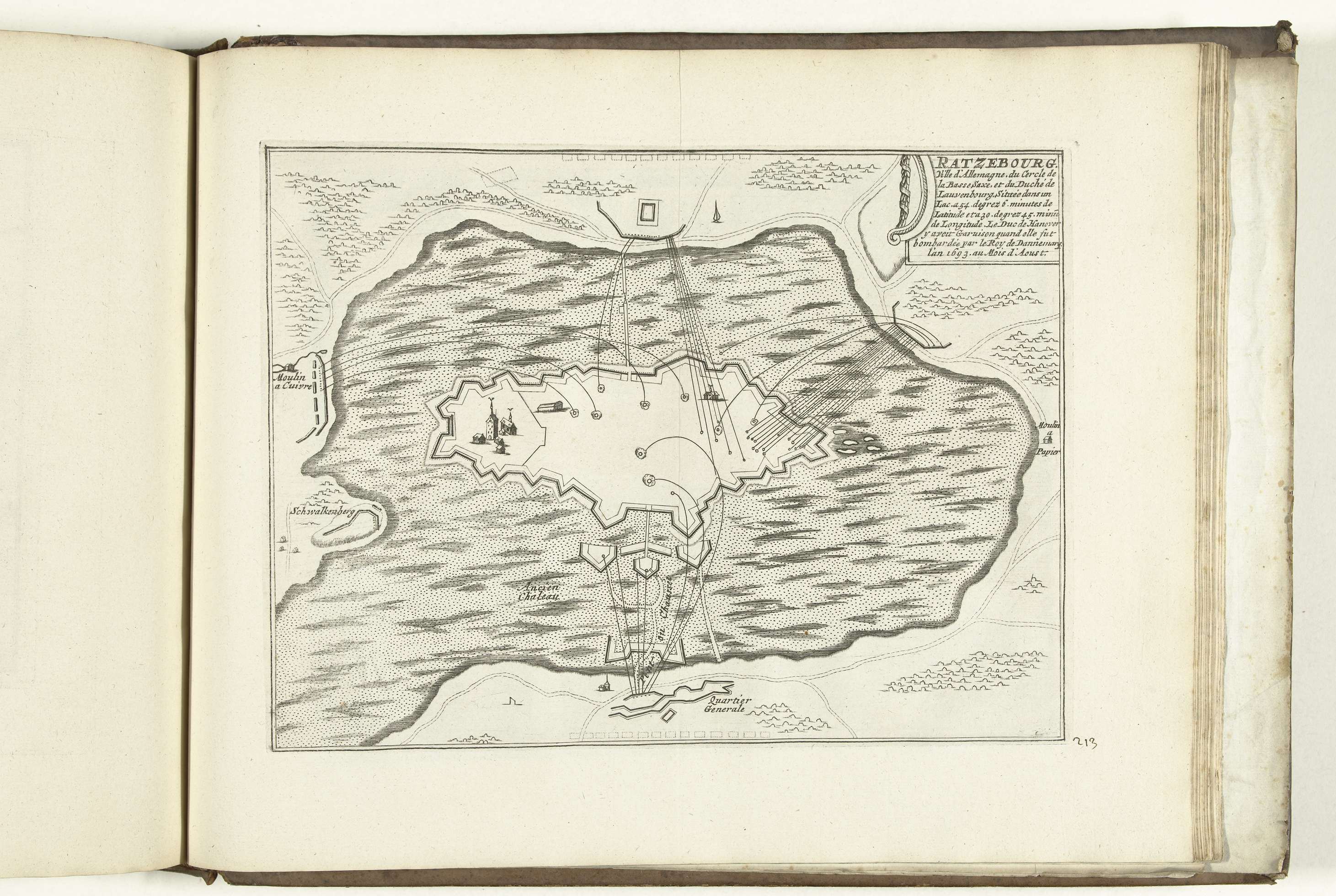 Bombardement van de stad Ratzeburg in Sleeswijk-Holstein door het Deense leger onder Christiaan V, van augustus 1693 tot april 1694. Plaat nr. 213 in deel IX van het prentwerk: Les Forces de l'Europe, Asie, Afrique et Amerique ... Comme aussi les Cartes des Côtes de France et d'Espagne uit 1726, dit eerste deel met 238 ...