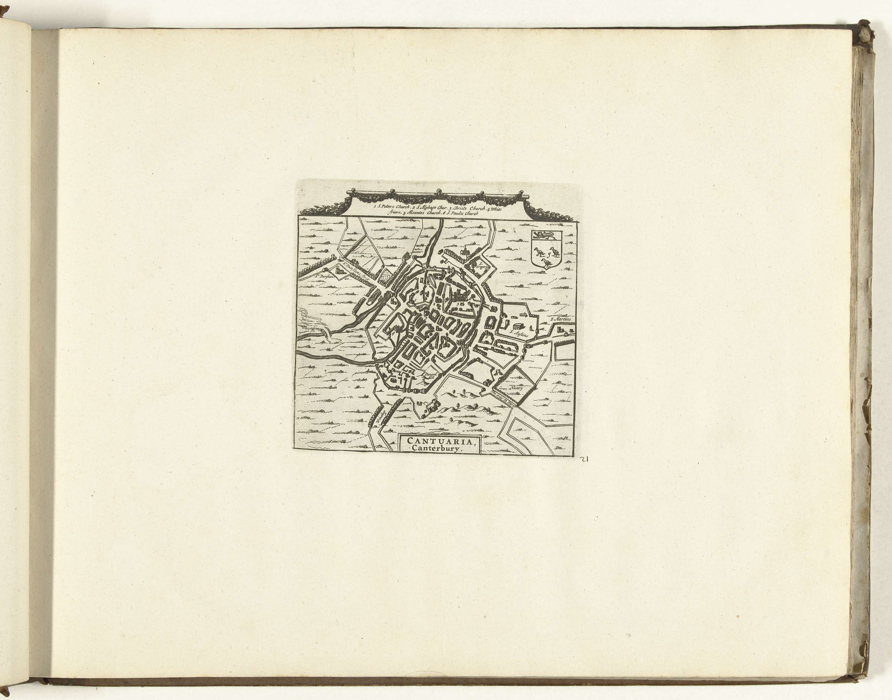 Plattegrond van de stad Canterbury. Plaat nr. 21 in deel I van het prentwerk: Les Forces de l'Europe, Asie, Afrique et Amerique ... Comme aussi les Cartes des Côtes de France et d'Espagne uit 1726, dit eerste deel met 238 met de hand genummerde platen van vermaarde sterke steden en vestingen in het kader van ...