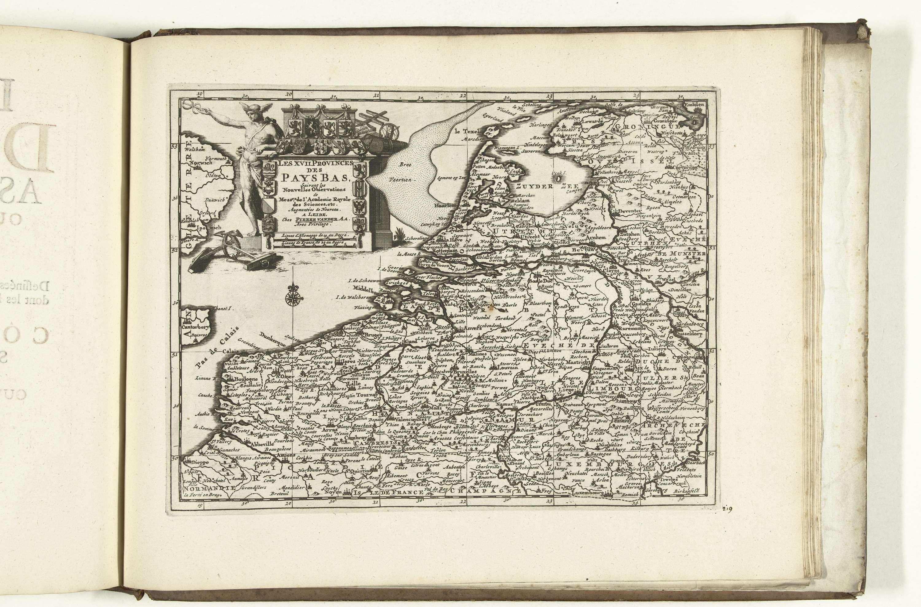 Kaart van de Nederlanden. Linksboven een cartouche met Mercurius en de wapens van de zeventien Nederlandse provincies. Plaat nr. 219 in deel X van het prentwerk: Les Forces de l'Europe, Asie, Afrique et Amerique ... Comme aussi les Cartes des Côtes de France et d'Espagne uit 1726, dit eerste deel met 238 met de hand ...