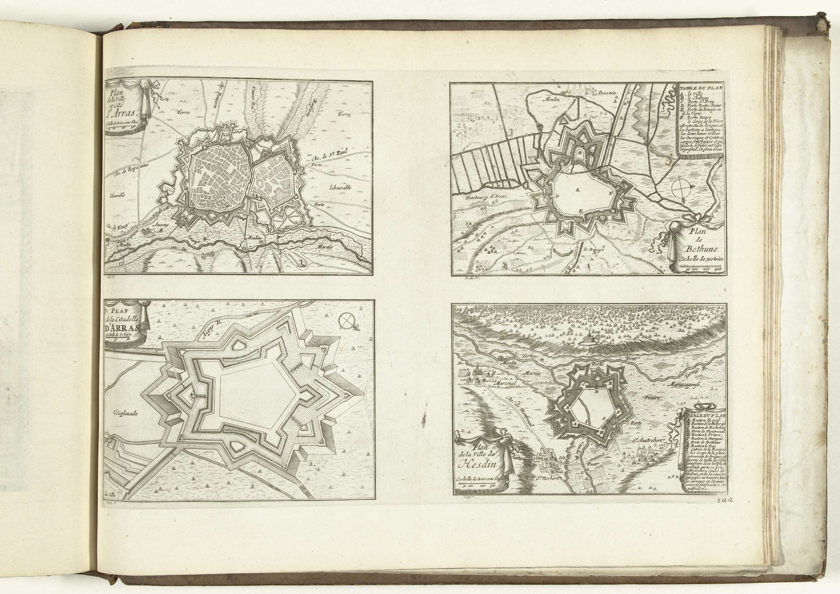 Blad met vier plattegronden van de verdedigingswerken om de steden Arras (Atrecht), Béthune en Hesdin. Plaat nr. 222 in deel X van het prentwerk: Les Forces de l'Europe, Asie, Afrique et Amerique ... Comme aussi les Cartes des Côtes de France et d'Espagne uit 1726, dit eerste deel met 238 met de hand genummerde platen ...