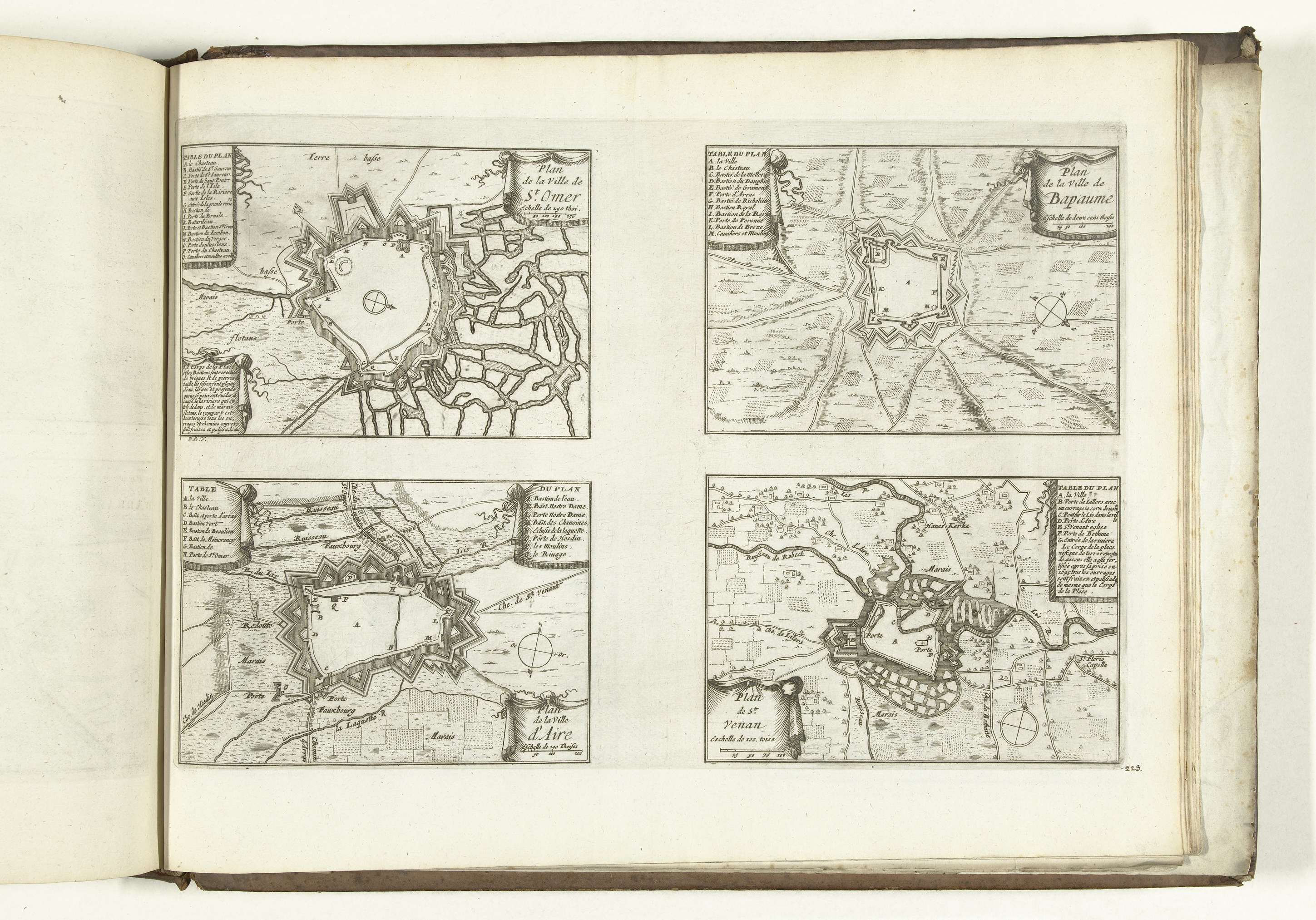 Blad met vier plattegronden van de verdedigingswerken om de steden Saint-Omer, Bapaume, Aire-sur-la-Lys en Saint-Venant. Plaat nr. 223 in deel X van het prentwerk: Les Forces de l'Europe, Asie, Afrique et Amerique ... Comme aussi les Cartes des Côtes de France et d'Espagne uit 1726, dit eerste deel met 238 met de hand genummerde platen ...