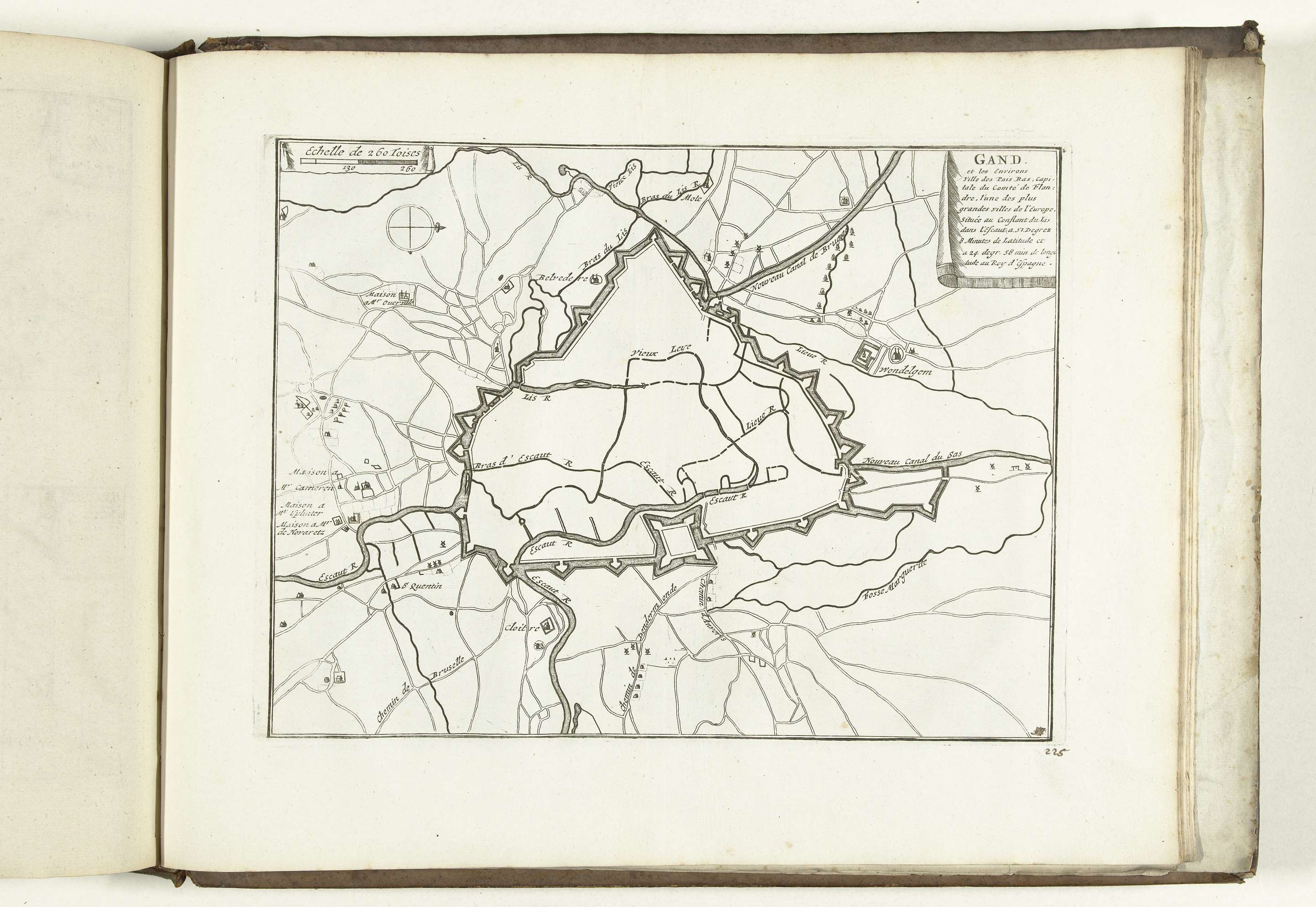 Plattegrond van de verdedigingswerken om de stad Gent. Plaat nr. 225 in deel X van het prentwerk: Les Forces de l'Europe, Asie, Afrique et Amerique ... Comme aussi les Cartes des Côtes de France et d'Espagne uit 1726, dit eerste deel met 238 met de hand genummerde platen van vermaarde sterke steden en vestingen in ...