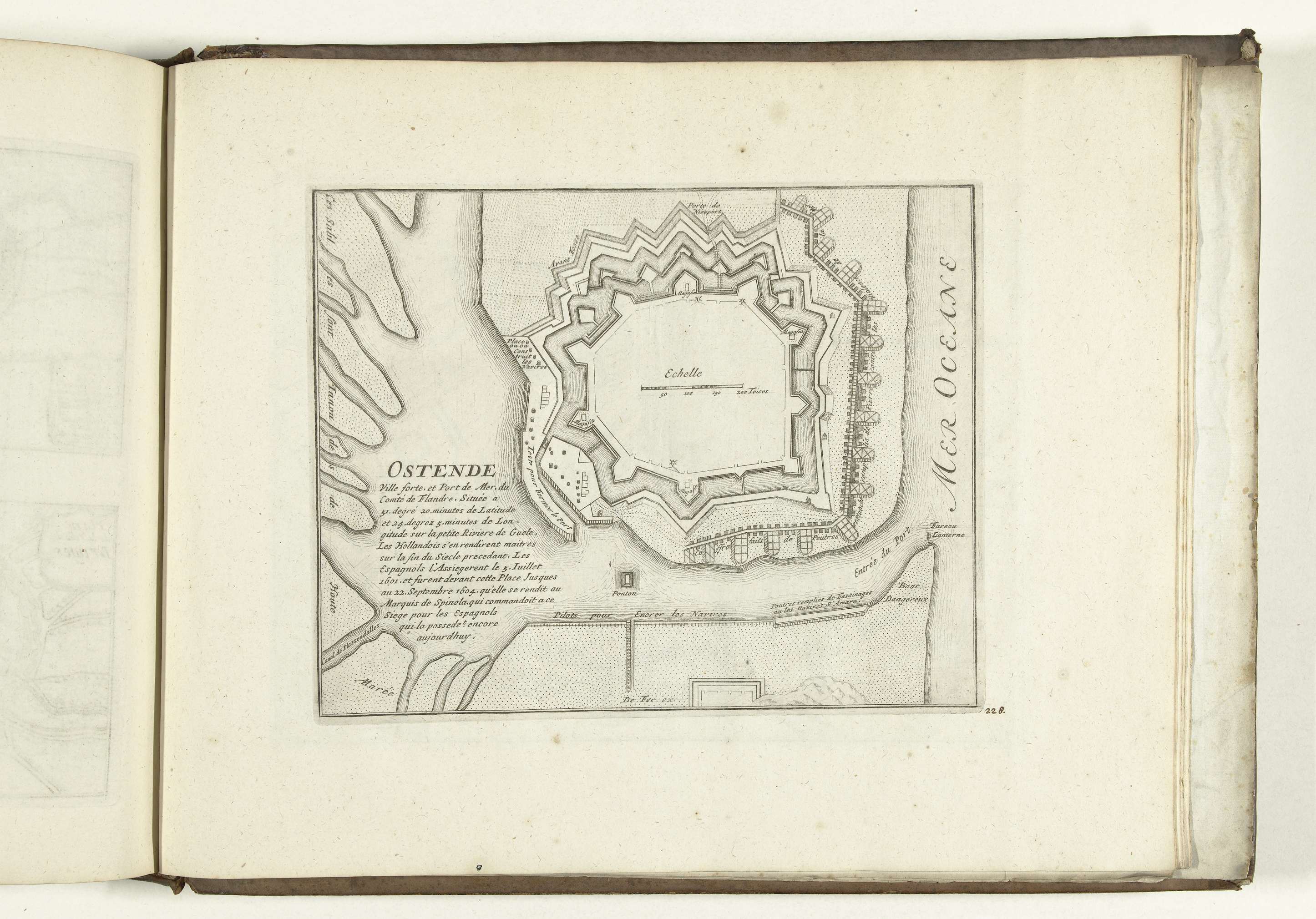 Plattegrond van de verdedigingswerken om de stad Oostende. Plaat nr. 228 in deel X van het prentwerk: Les Forces de l'Europe, Asie, Afrique et Amerique ... Comme aussi les Cartes des Côtes de France et d'Espagne uit 1726, dit eerste deel met 238 met de hand genummerde platen van vermaarde sterke steden en vestingen in ...