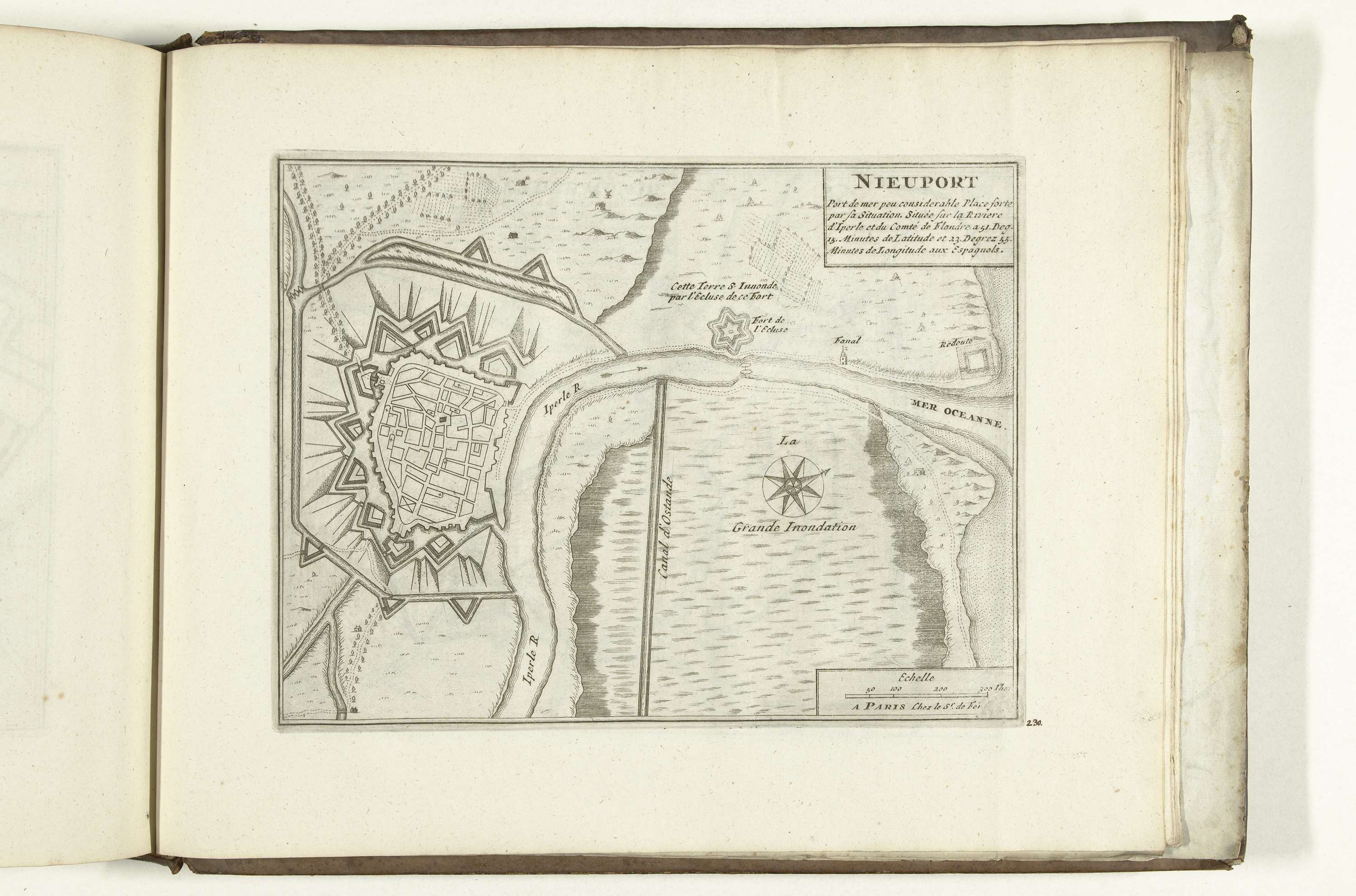 Plattegrond van de verdedigingswerken om de stad Nieuwpoort. Plaat nr. 230 in deel X van het prentwerk: Les Forces de l'Europe, Asie, Afrique et Amerique ... Comme aussi les Cartes des Côtes de France et d'Espagne uit 1726, dit eerste deel met 238 met de hand genummerde platen van vermaarde sterke steden en vestingen in ...