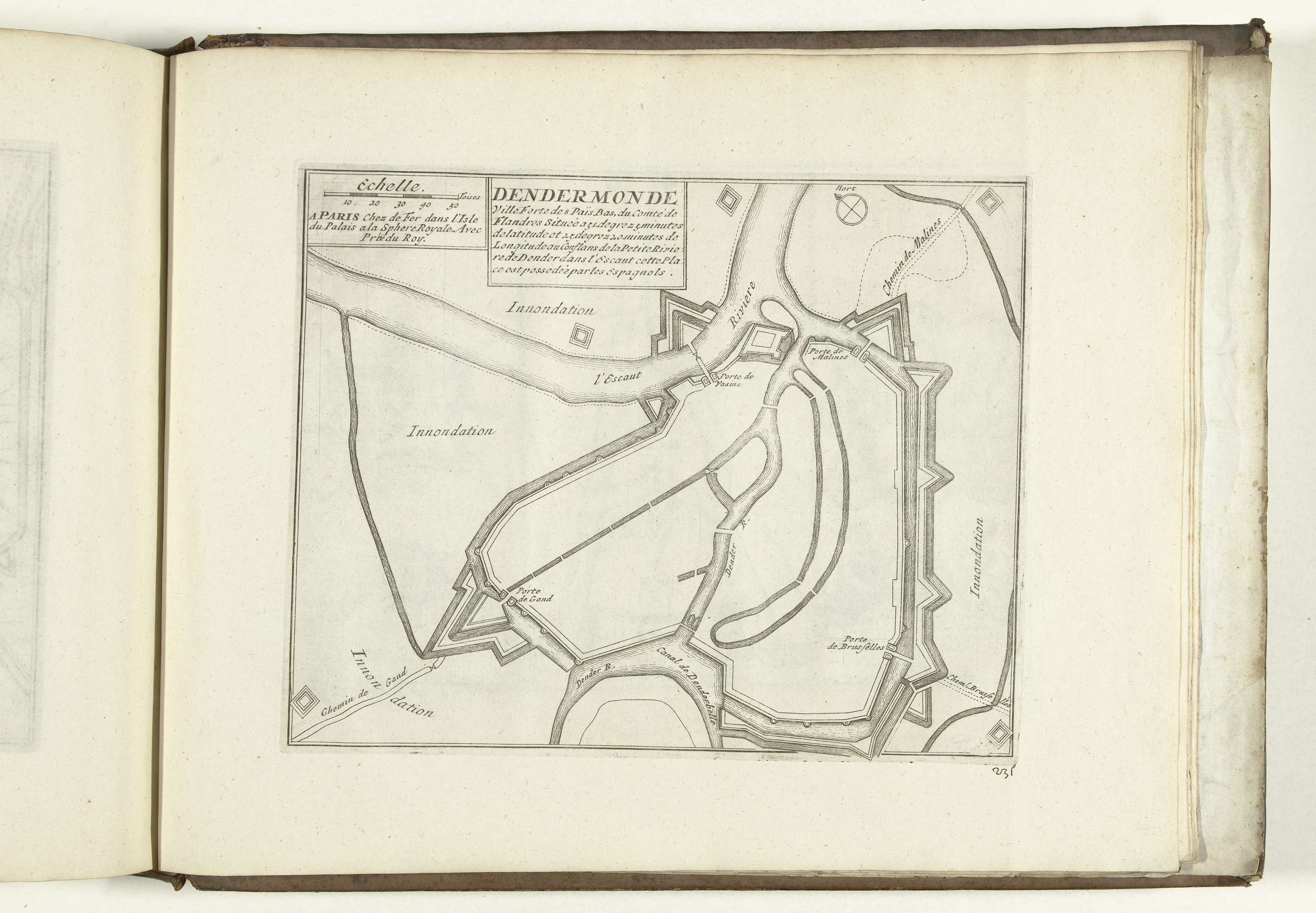 Plattegrond van de verdedigingswerken om de stad Dendermonde. Plaat nr. 231 in deel X van het prentwerk: Les Forces de l'Europe, Asie, Afrique et Amerique ... Comme aussi les Cartes des Côtes de France et d'Espagne uit 1726, dit eerste deel met 238 met de hand genummerde platen van vermaarde sterke steden en vestingen in ...