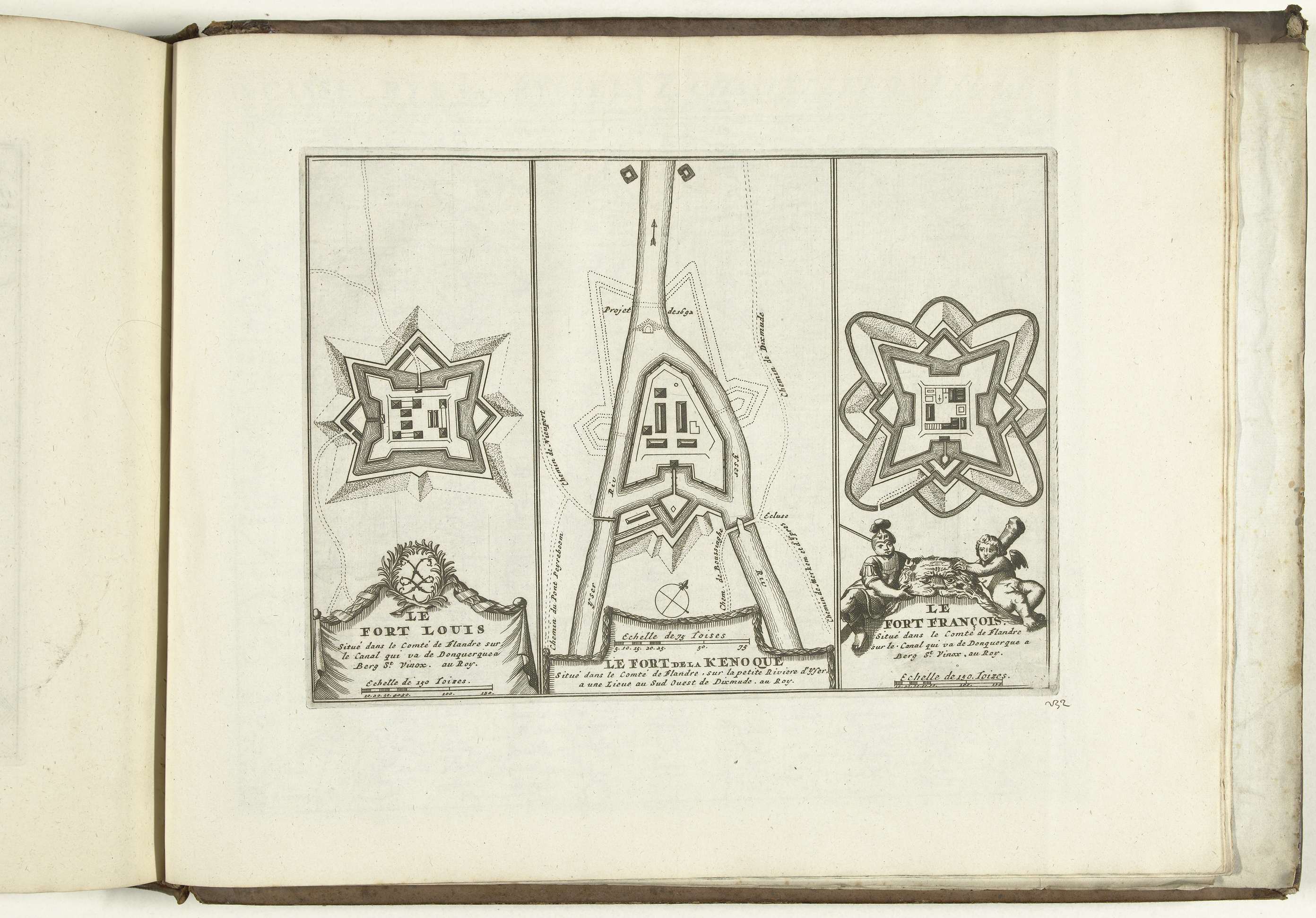 De plattegronden van drie Franse forten in Vlaanderen. Plaat nr. 232 in deel X van het prentwerk: Les Forces de l'Europe, Asie, Afrique et Amerique ... Comme aussi les Cartes des Côtes de France et d'Espagne uit 1726, dit eerste deel met 238 met de hand genummerde platen van vermaarde sterke steden en vestingen in ...