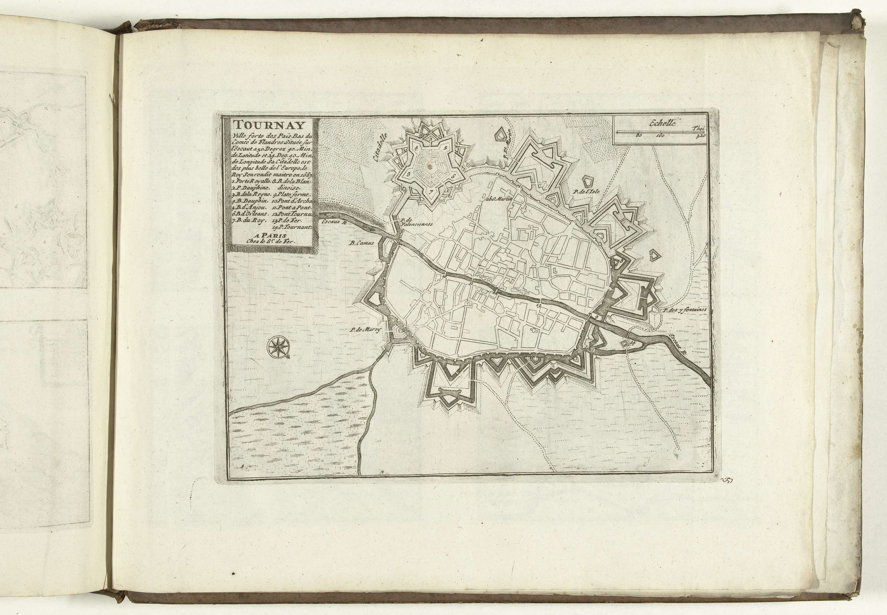 Plattegrond van de verdedigingswerken om de stad Tournai (Doornik). Plaat nr. 237 in deel X van het prentwerk: Les Forces de l'Europe, Asie, Afrique et Amerique ... Comme aussi les Cartes des Côtes de France et d'Espagne uit 1726, dit eerste deel met 238 met de hand genummerde platen van vermaarde sterke steden en vestingen ...