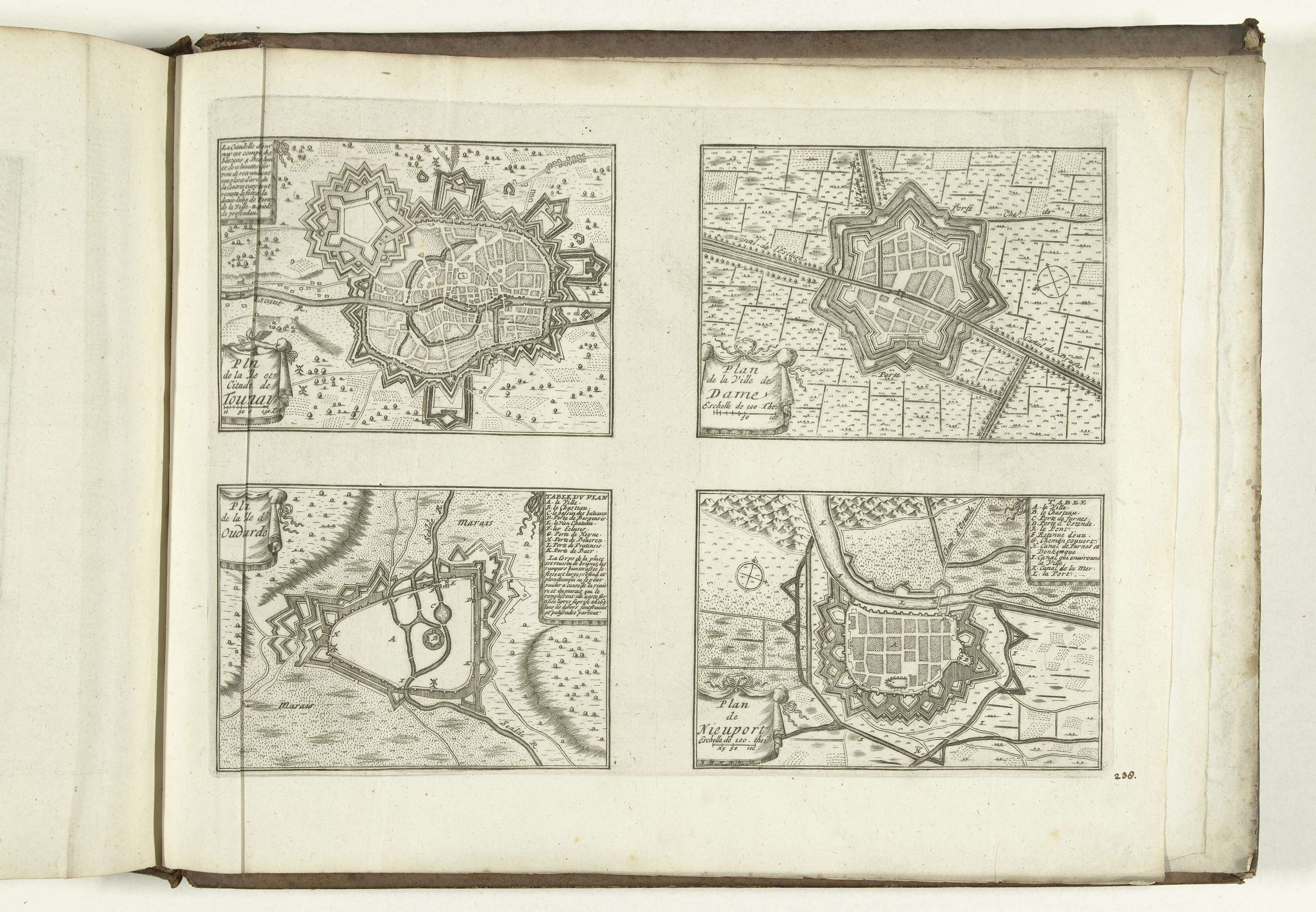 Blad met vier plattegronden van de verdedigingswerken om de Vlaamse steden Tournai, Damme, Oudenaarde en Nieuwpoort. Plaat nr. 238 in deel X van het prentwerk: Les Forces de l'Europe, Asie, Afrique et Amerique ... Comme aussi les Cartes des Côtes de France et d'Espagne uit 1726, dit eerste deel met 238 met de hand genummerde ...