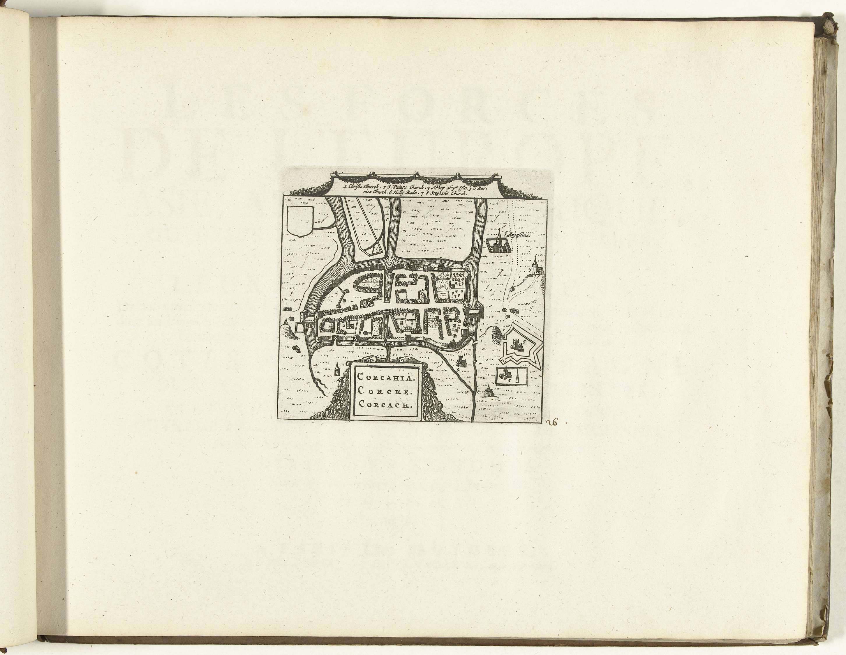 Plattegrond van Cork. Plaat nr. 26 in deel I van het prentwerk: Les Forces de l'Europe, Asie, Afrique et Amerique ... Comme aussi les Cartes des Côtes de France et d'Espagne uit 1726, dit eerste deel met 238 met de hand genummerde platen van vermaarde sterke steden en vestingen in het kader van de Spaanse ...