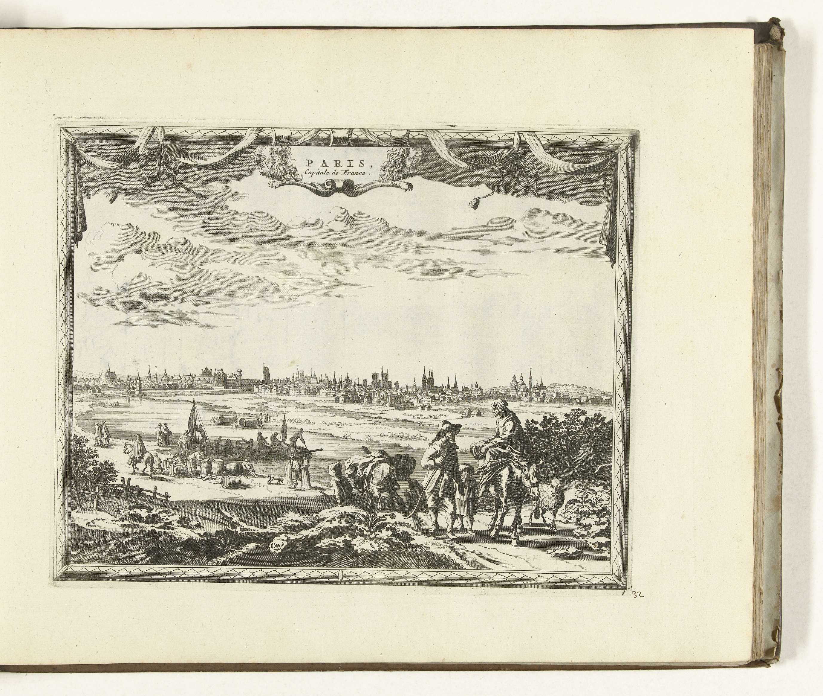 Gezicht op Parijs, op de voorgrond reizigers. Plaat nr. 32 in deel II van het prentwerk: Les Forces de l'Europe, Asie, Afrique et Amerique ... Comme aussi les Cartes des Côtes de France et d'Espagne uit 1726, dit eerste deel met 238 met de hand genummerde platen van vermaarde sterke steden en vestingen in het ...