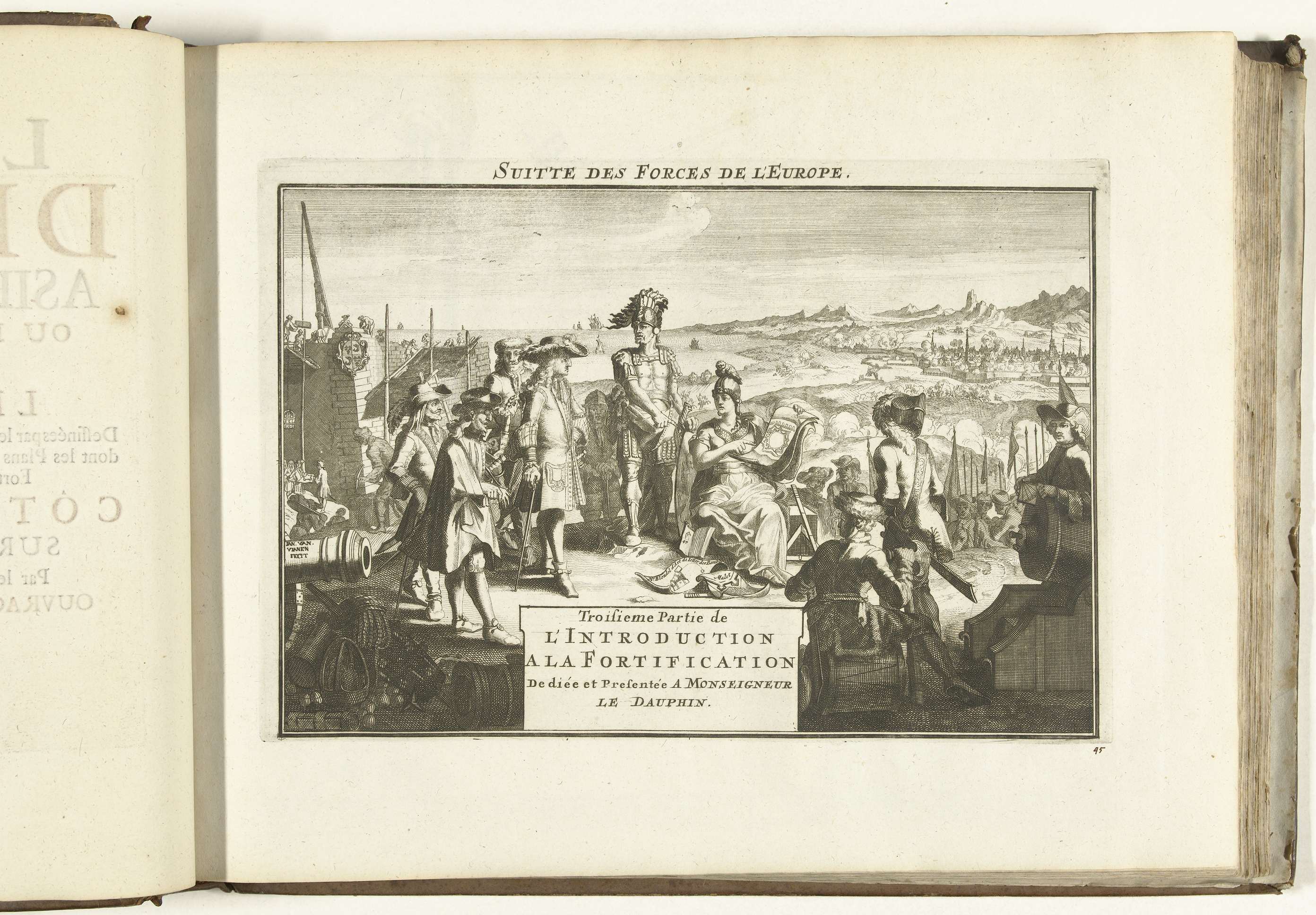 Titelprent met Franse legeraanvoerders en ingenieurs met Minerva en Mars, nr. 45. Titelprent voor deel III van het prentwerk: Les Forces de l'Europe, Asie, Afrique et Amerique ... Comme aussi les Cartes des Côtes de France et d'Espagne uit 1726, dit eerste deel met 238 met de hand genummerde platen van vermaarde sterke steden en ...