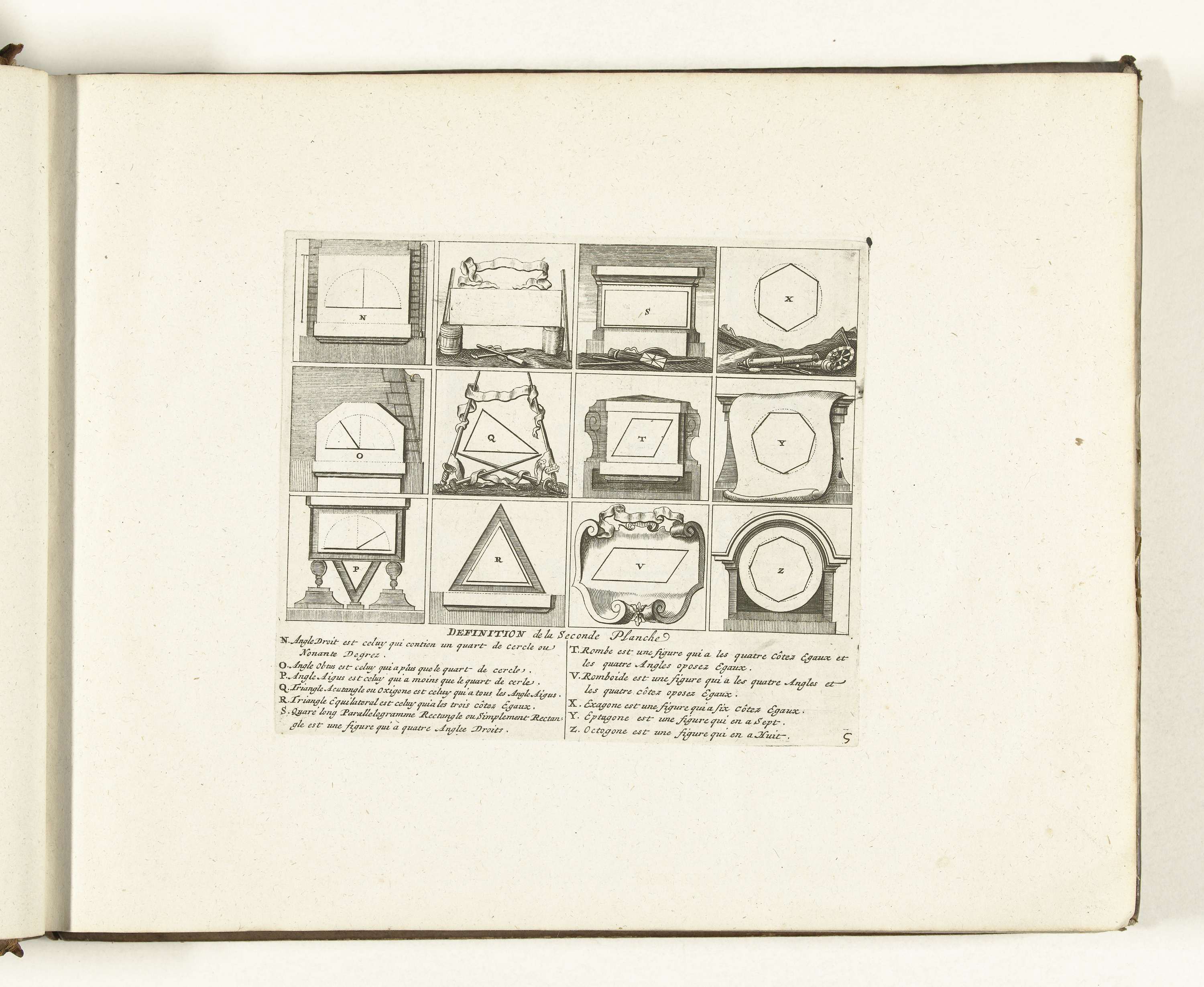 Tweede plaat met 12 geometrische figuren toegepast in de vestingbouw. Plaat nr. 5 in deel I van het prentwerk: Les Forces de l'Europe, Asie, Afrique et Amerique ... Comme aussi les Cartes des Côtes de France et d'Espagne uit 1726, dit eerste deel met 238 met de hand genummerde platen van vermaarde sterke steden en ...