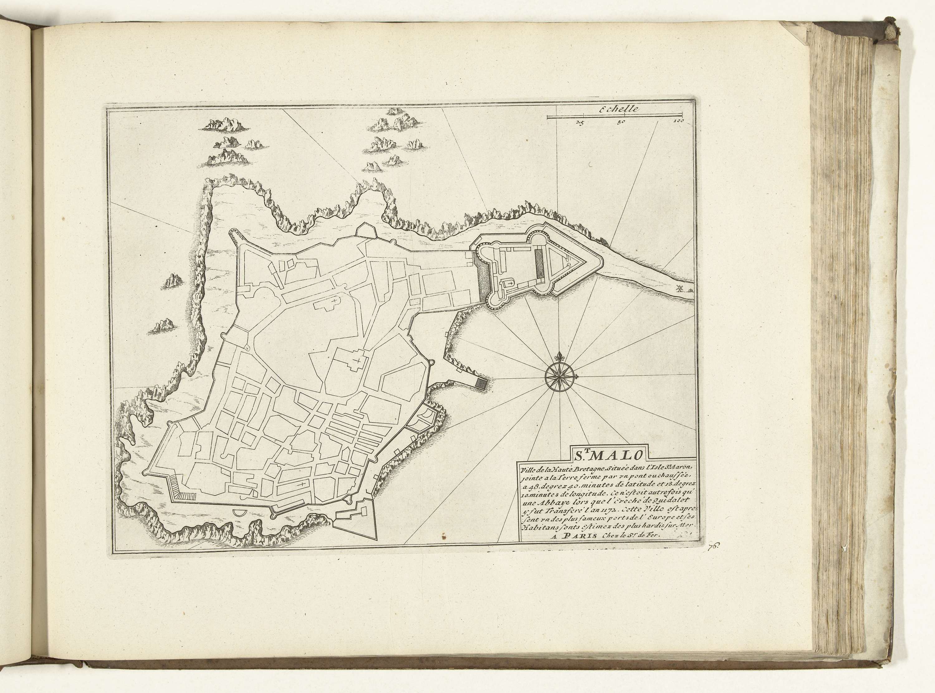 Plattegrond van de versterkingen om de Franse stad Saint-Malo. Plaat nr. 76 in deel IV van het prentwerk: Les Forces de l'Europe, Asie, Afrique et Amerique ... Comme aussi les Cartes des Côtes de France et d'Espagne uit 1726, dit eerste deel met 238 met de hand genummerde platen van vermaarde sterke steden en vestingen ...