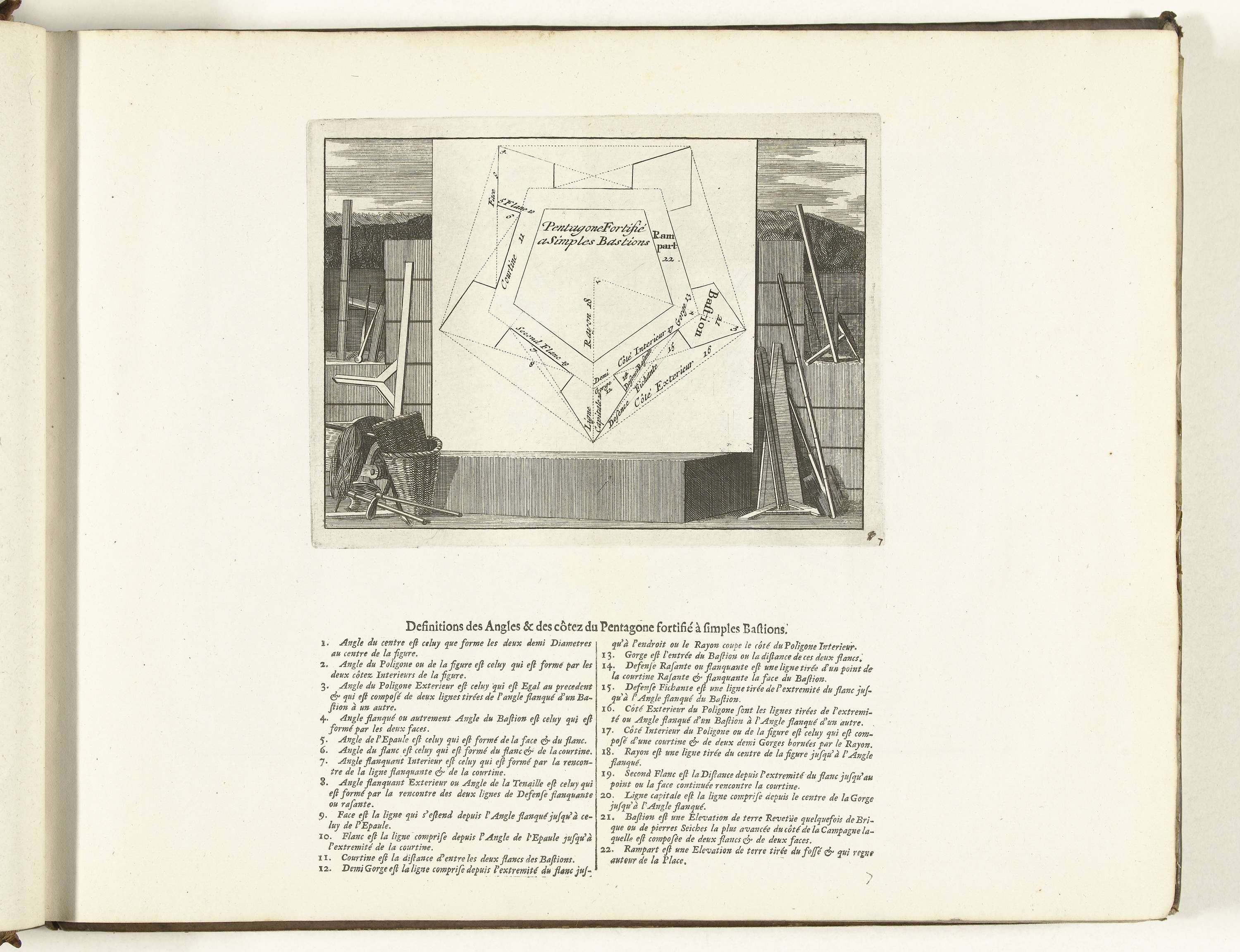 Toepassing van de vijfhoek in de vestingbouw. Onder de plaat gedrukte uitleg in 22 punten. Plaat nr. 7 in deel I van het prentwerk: Les Forces de l'Europe, Asie, Afrique et Amerique ... Comme aussi les Cartes des Côtes de France et d'Espagne uit 1726, dit eerste deel met 238 met de hand genummerde platen ...