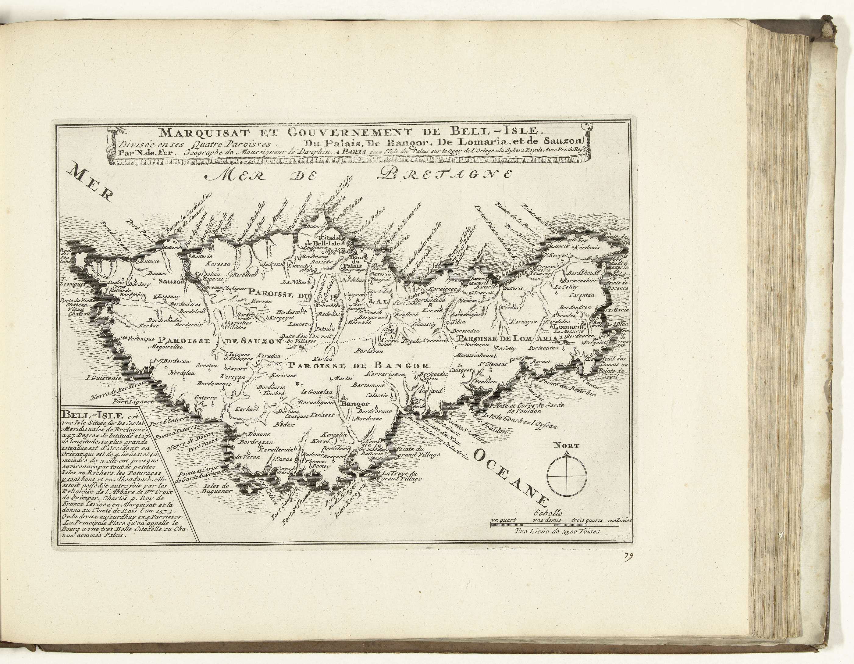 Kaart van de markizaat van Belle Ile. Plaat nr. 79 in deel IV van het prentwerk: Les Forces de l'Europe, Asie, Afrique et Amerique ... Comme aussi les Cartes des Côtes de France et d'Espagne uit 1726, dit eerste deel met 238 met de hand genummerde platen van vermaarde sterke steden en vestingen in het ...