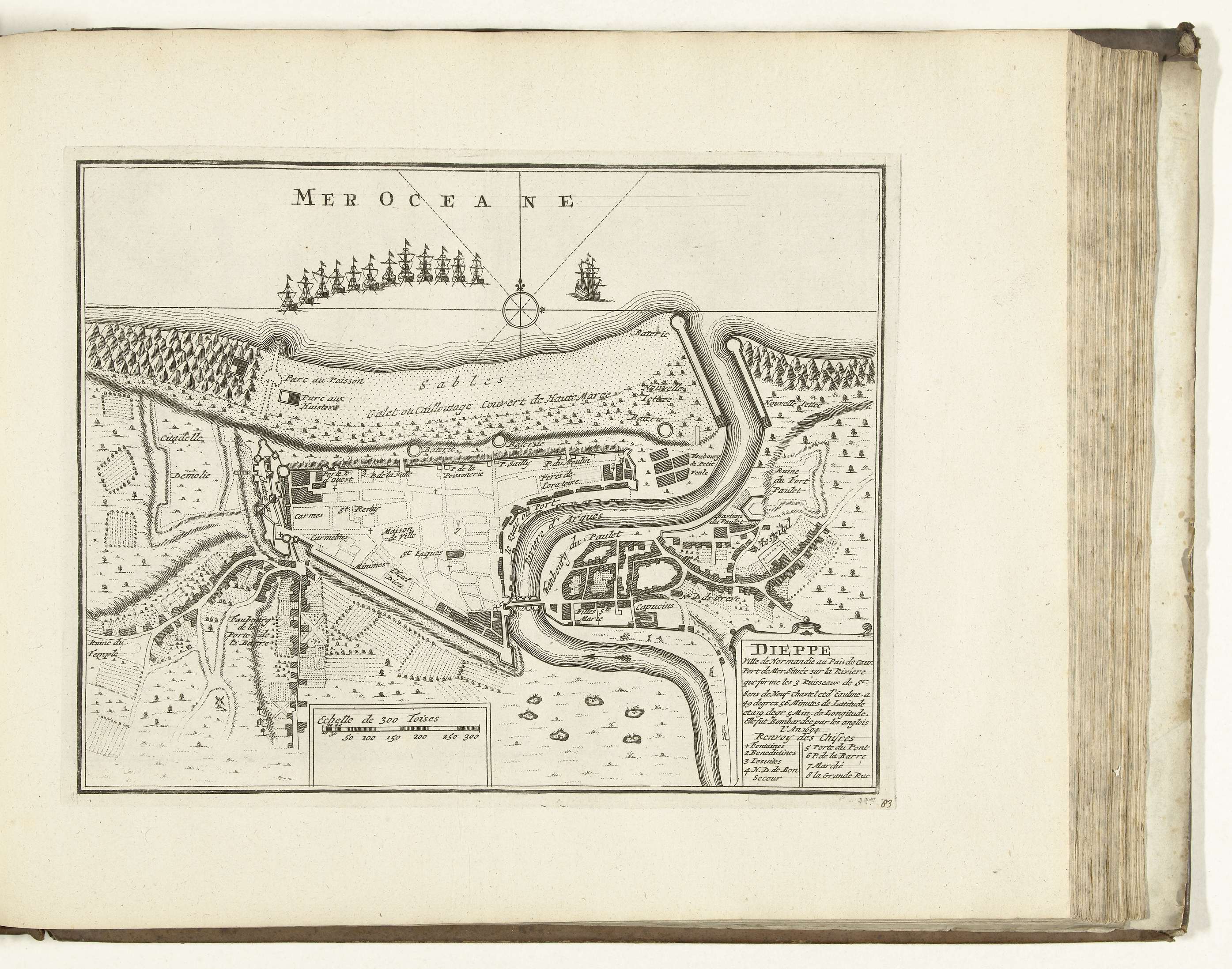 Plattegrond van de Franse havenstad Dieppe, gebombardeerd door de geallieerden in juli 1694. Plaat nr. 83 in deel IV van het prentwerk: Les Forces de l'Europe, Asie, Afrique et Amerique ... Comme aussi les Cartes des Côtes de France et d'Espagne uit 1726, dit eerste deel met 238 met de hand genummerde platen van vermaarde ...