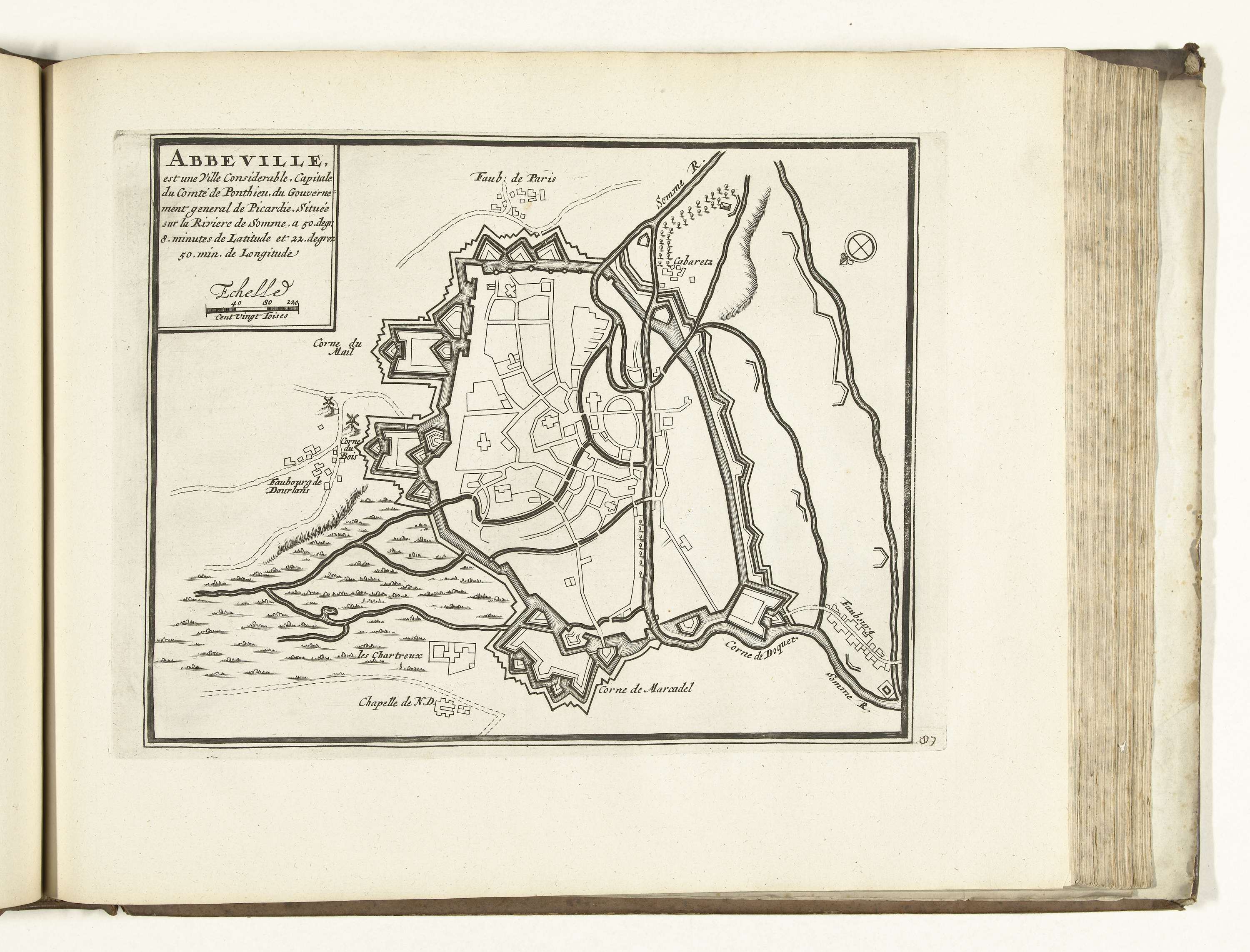 Plattegrond van de versterkingen om de Franse stad Abbeville. Plaat nr. 87 in deel IV van het prentwerk: Les Forces de l'Europe, Asie, Afrique et Amerique ... Comme aussi les Cartes des Côtes de France et d'Espagne uit 1726, dit eerste deel met 238 met de hand genummerde platen van vermaarde sterke steden en vestingen ...