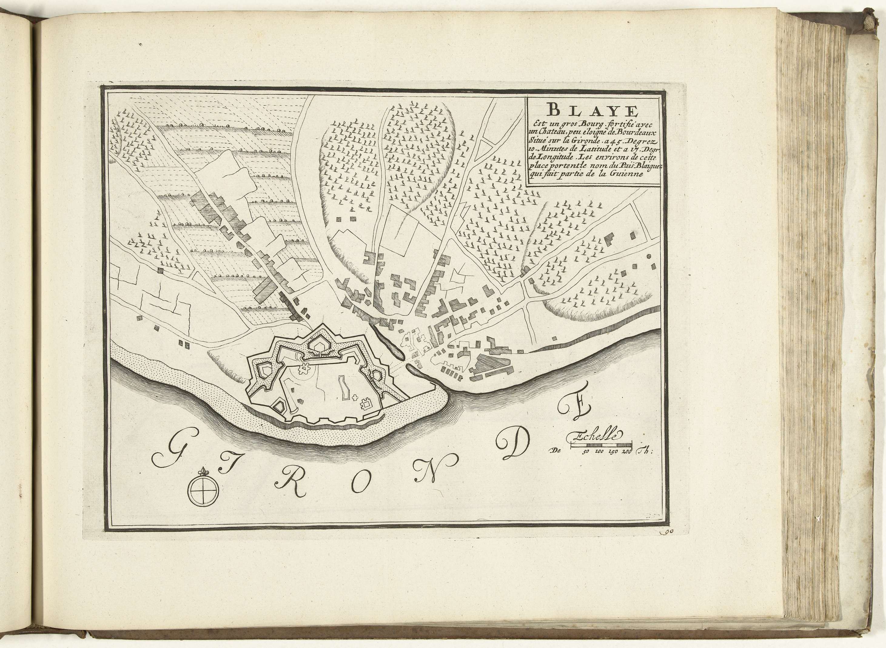Plattegrond van de versterkingen om de Franse stad Blaye. Plaat nr. 90 in deel IV van het prentwerk: Les Forces de l'Europe, Asie, Afrique et Amerique ... Comme aussi les Cartes des Côtes de France et d'Espagne uit 1726, dit eerste deel met 238 met de hand genummerde platen van vermaarde sterke steden en vestingen ...