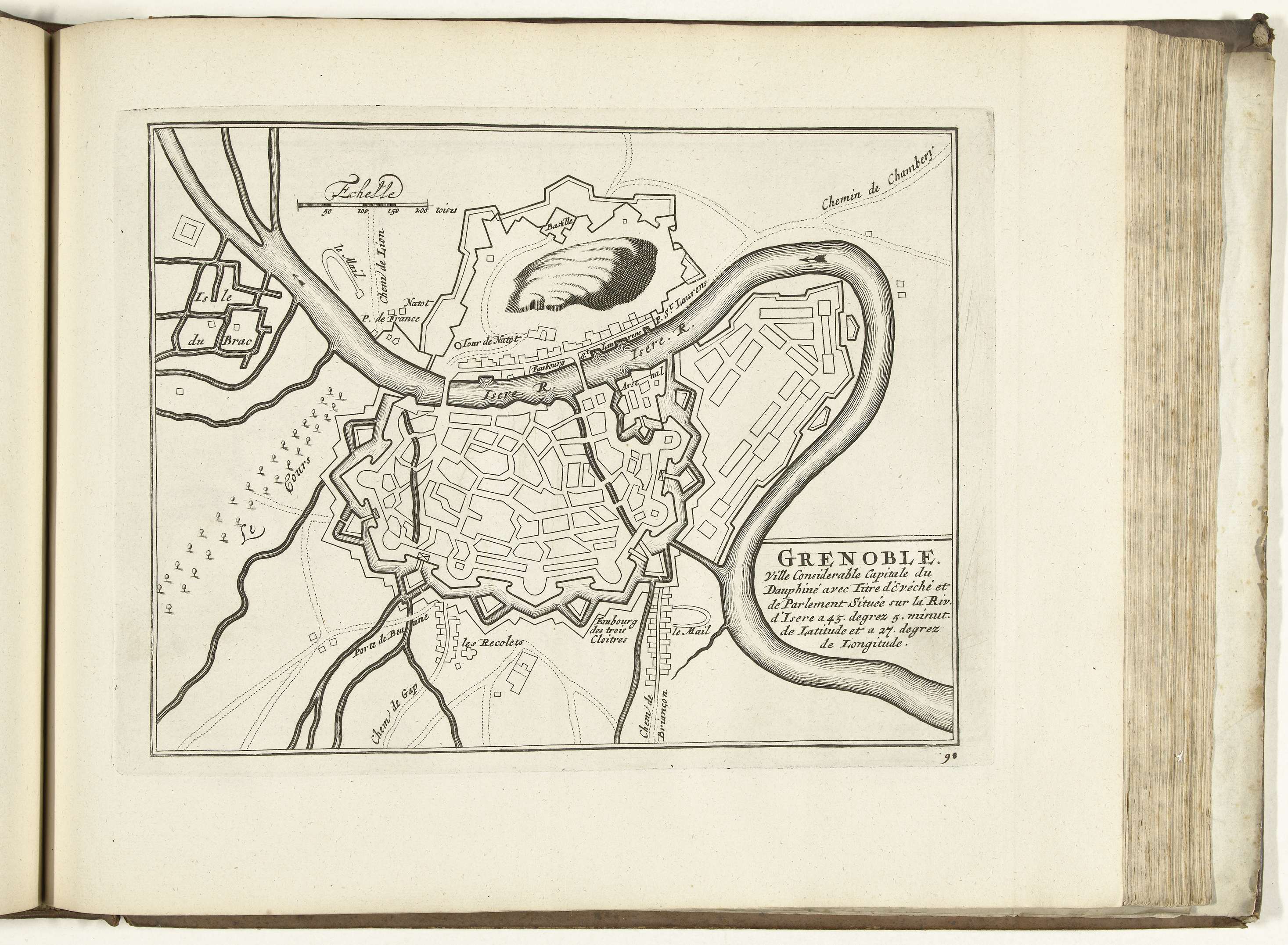 Plattegrond van de versterkingen om de Franse stad Grenoble. Plaat nr. 98 in deel IV van het prentwerk: Les Forces de l'Europe, Asie, Afrique et Amerique ... Comme aussi les Cartes des Côtes de France et d'Espagne uit 1726, dit eerste deel met 238 met de hand genummerde platen van vermaarde sterke steden en vestingen ...