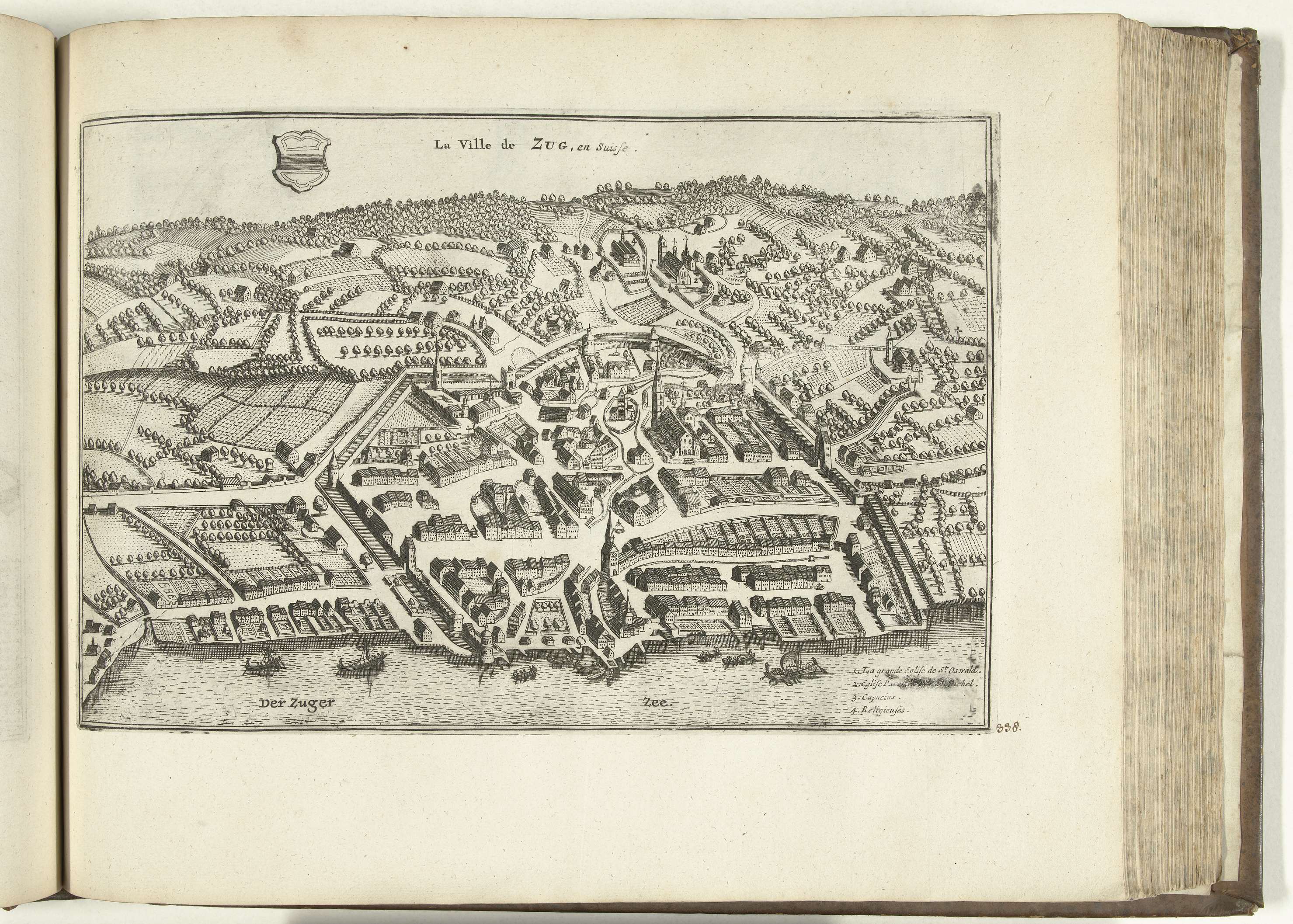 Gezicht op Zug in Zwitserland. Plaat nr. 338 in deel XIV van het prentwerk: Les Forces de l'Europe, Asie, Afrique et Amerique ... Comme aussi les Cartes des Côtes de France et d'Espagne uit 1726, dit tweede deel met 271 met de hand genummerde platen van vermaarde sterke steden en vestingen in het kader van ...