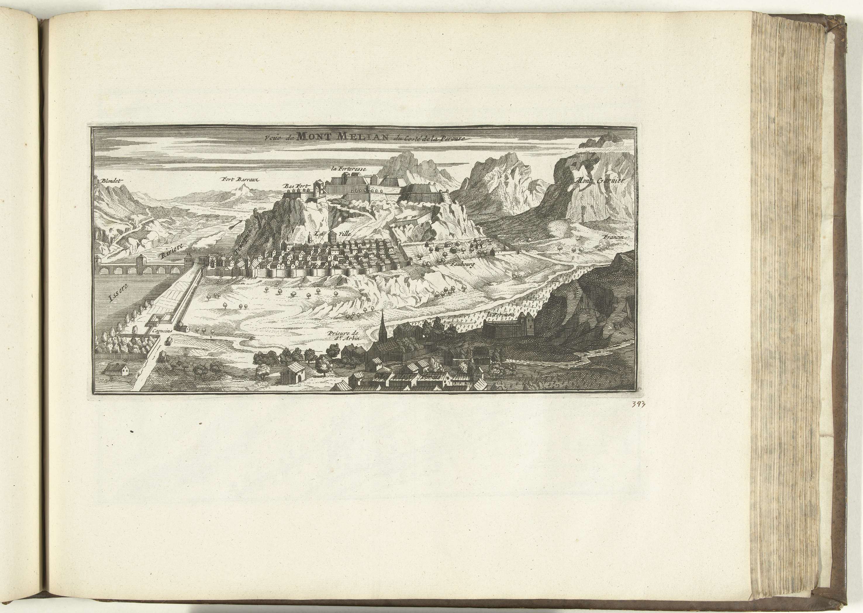 Gezicht op de vesting van Montmélian. Plaat nr. 343 in deel XIV van het prentwerk: Les Forces de l'Europe, Asie, Afrique et Amerique ... Comme aussi les Cartes des Côtes de France et d'Espagne uit 1726, dit tweede deel met 271 met de hand genummerde platen van vermaarde sterke steden en vestingen in het kader ...