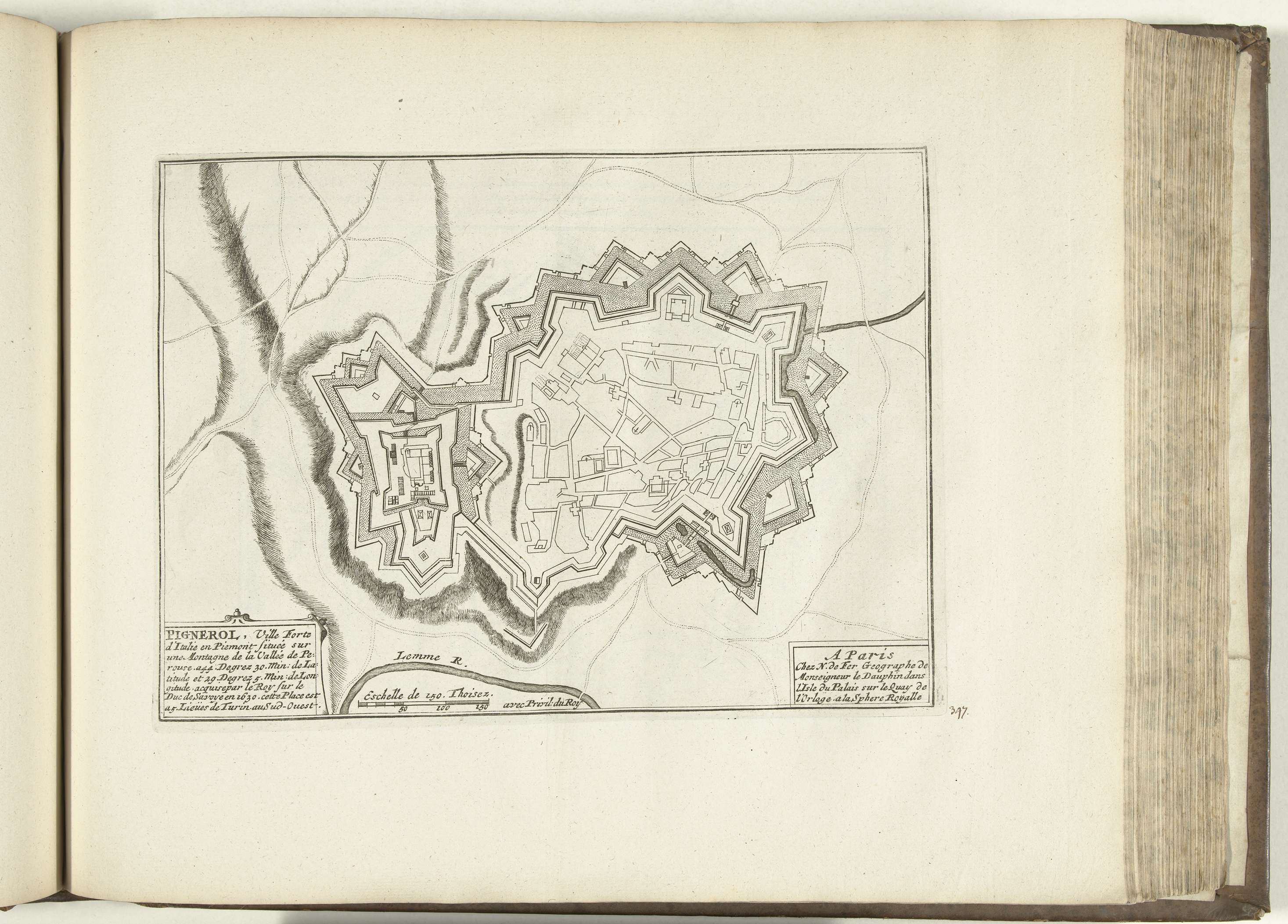 Plattegrond van de versterkingen om de Italiaanse stad Pinerolo (Pignerol). Plaat nr. 347 in deel XIV van het prentwerk: Les Forces de l'Europe, Asie, Afrique et Amerique ... Comme aussi les Cartes des Côtes de France et d'Espagne uit 1726, dit tweede deel met 271 met de hand genummerde platen van vermaarde sterke steden en ...