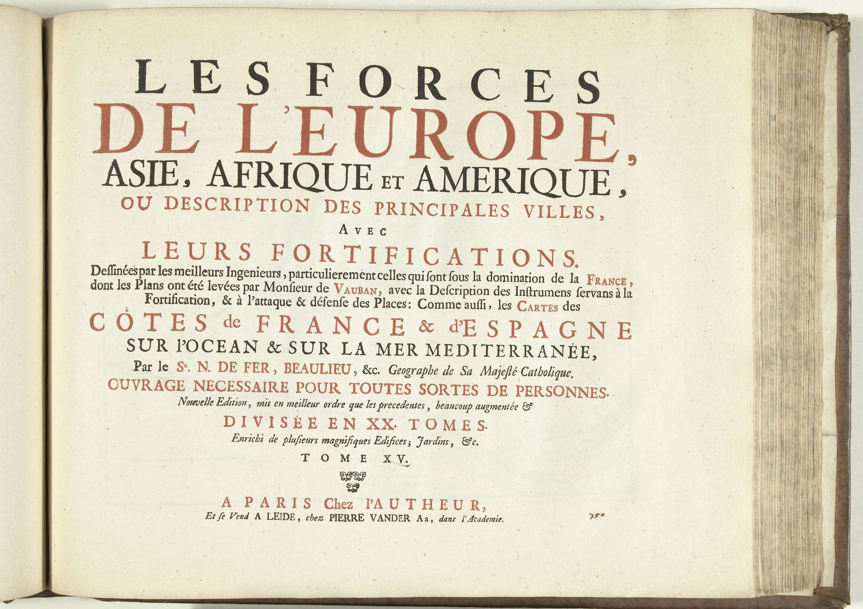 Titelpagina gedrukt in zwart en rood voor deel XV van het prentwerk Les Forces de l'Europe, Asie, Afrique et Amerique ... Comme aussi les Cartes des Côtes de France et d'Espagne, 1726. Dit tweede deel van het prentwerk bestaat uit 271 met de hand genummerde platen van vermaarde sterke steden en vestingen in het kader ...