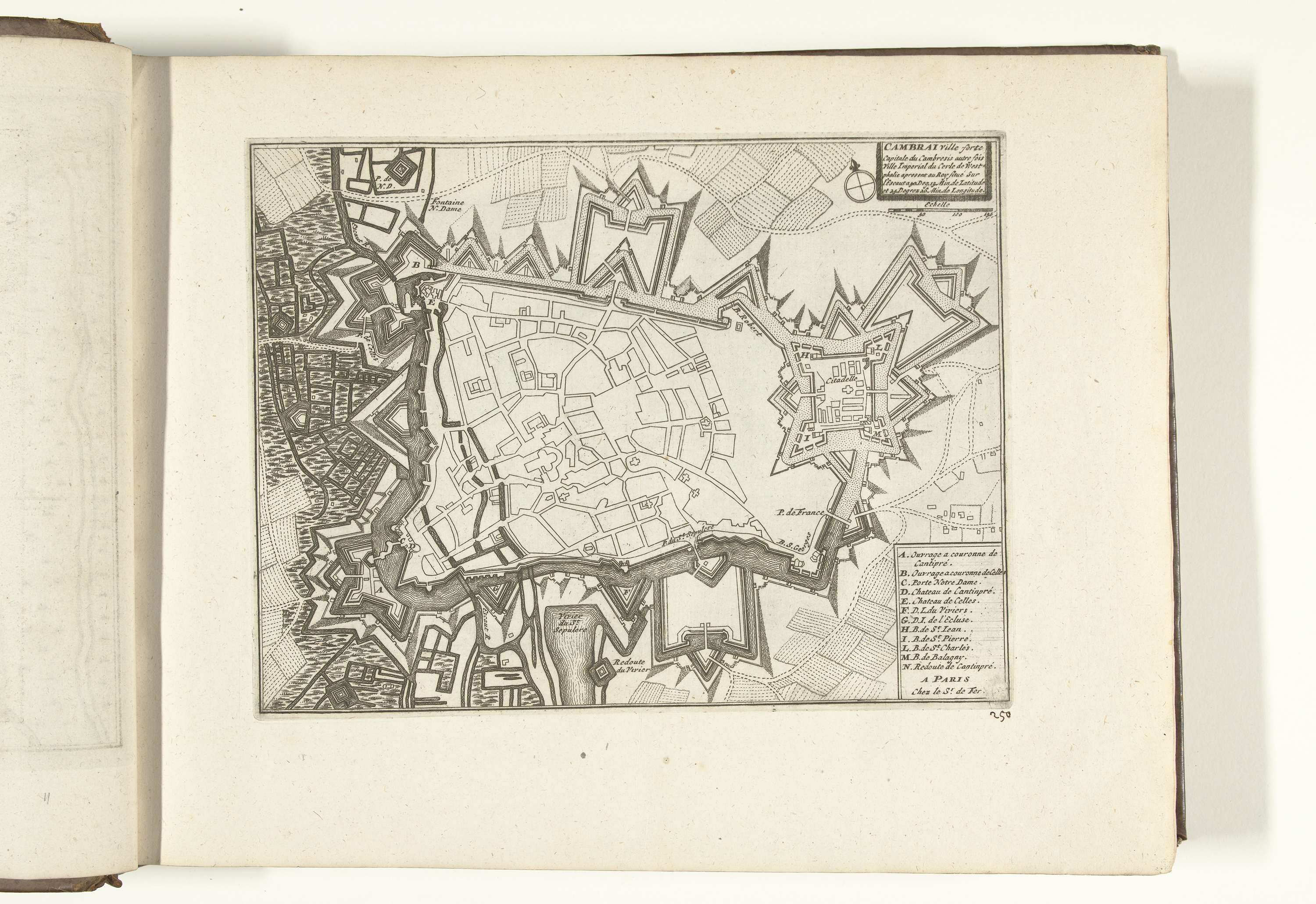 Plattegrond van de versterkingen om de stad Cambrai (Kamerijk). Plaat nr. 250 in deel XI van het prentwerk: Les Forces de l'Europe, Asie, Afrique et Amerique ... Comme aussi les Cartes des Côtes de France et d'Espagne uit 1726, dit tweede deel met 271 met de hand genummerde platen van vermaarde sterke steden en vestingen ...