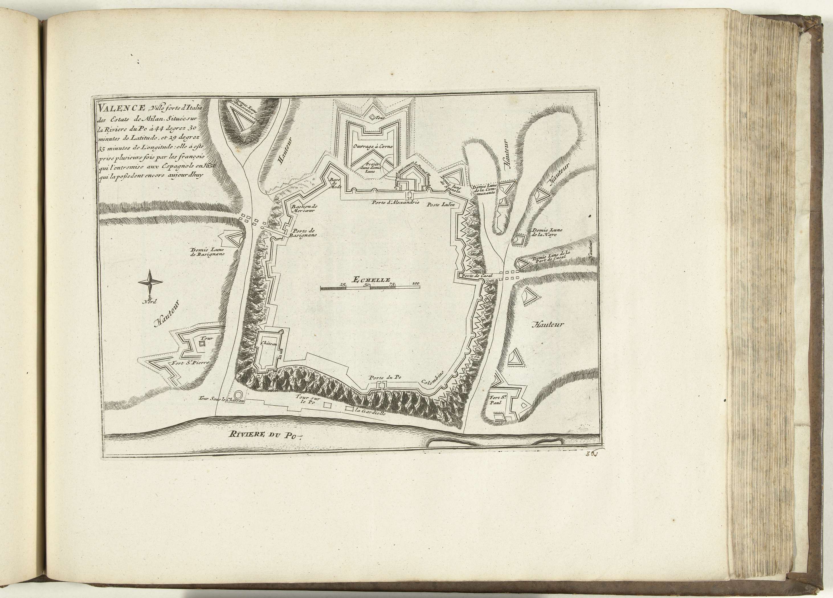 Plattegrond van de versterkingen om de Italiaanse stad Valenza aan de Po. Plaat nr. 361 in deel XV van het prentwerk: Les Forces de l'Europe, Asie, Afrique et Amerique ... Comme aussi les Cartes des Côtes de France et d'Espagne uit 1726, dit tweede deel met 271 met de hand genummerde platen van vermaarde sterke ...