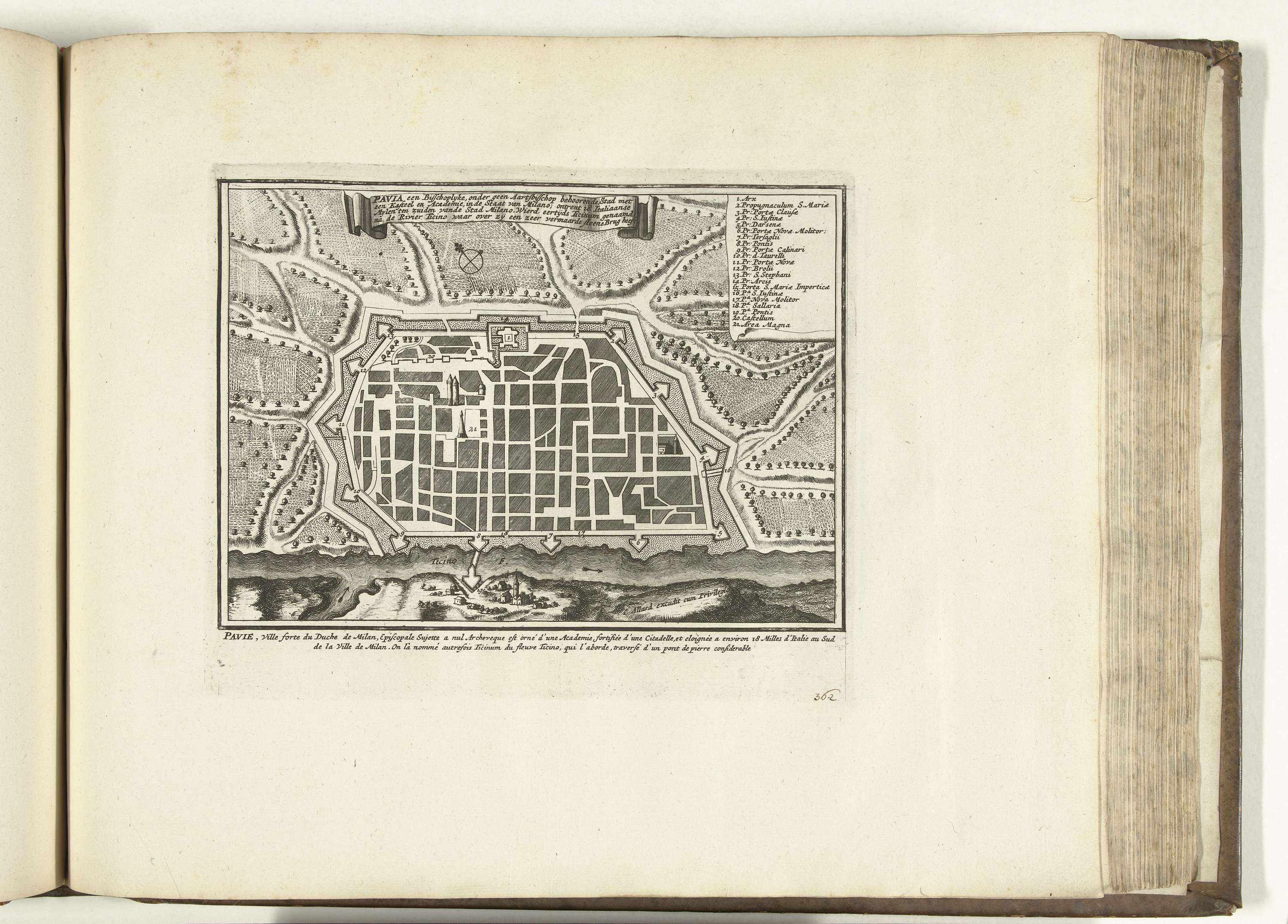 Plattegrond van de versterkingen om de Italiaanse stad Pavia. Plaat nr. 362 in deel XV van het prentwerk: Les Forces de l'Europe, Asie, Afrique et Amerique ... Comme aussi les Cartes des Côtes de France et d'Espagne uit 1726, dit tweede deel met 271 met de hand genummerde platen van vermaarde sterke steden en vestingen ...