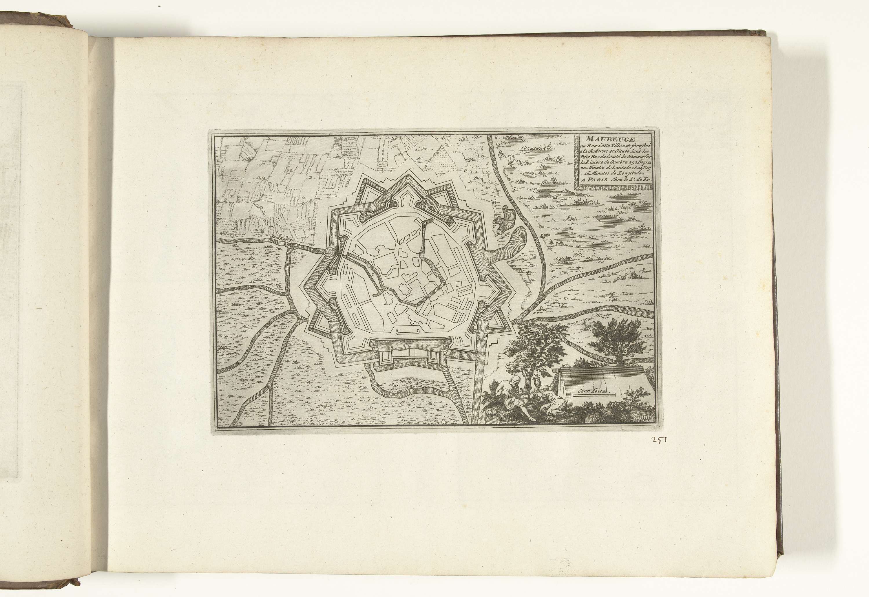 Plattegrond van de versterkingen om de stad Maubeuge in de graafschap Henegouwen. Plaat nr. 251 in deel XI van het prentwerk: Les Forces de l'Europe, Asie, Afrique et Amerique ... Comme aussi les Cartes des Côtes de France et d'Espagne uit 1726, dit tweede deel met 271 met de hand genummerde platen van vermaarde sterke ...