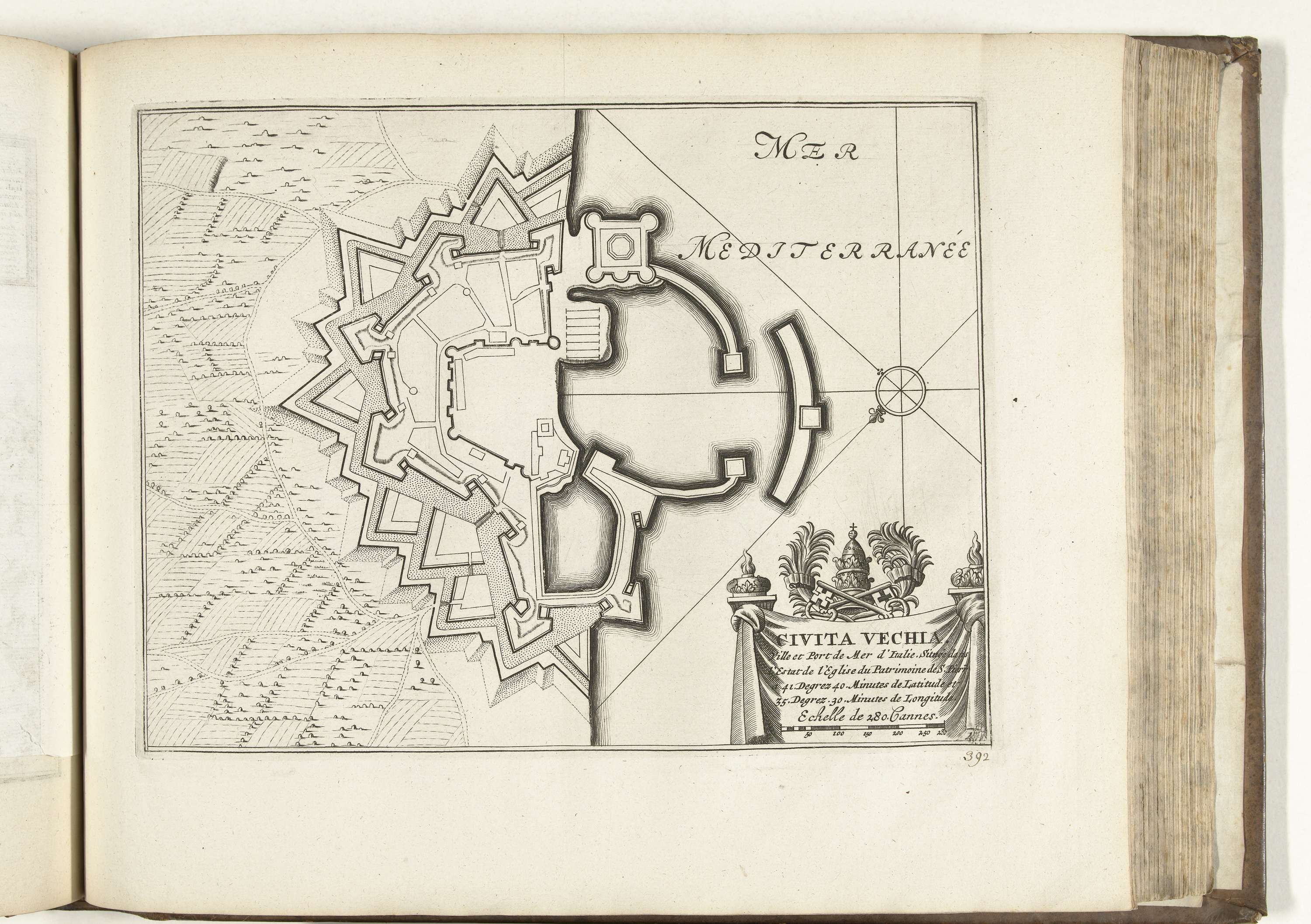 Plattegrond van de versterkingen om de Italiaanse stad Civitavecchia, 1726. Plaat nr. 392 in deel XVI van het prentwerk: Les Forces de l'Europe, Asie, Afrique et Amerique ... Comme aussi les Cartes des Côtes de France et d'Espagne uit 1726, dit tweede deel met 271 met de hand genummerde platen van vermaarde sterke steden en ...