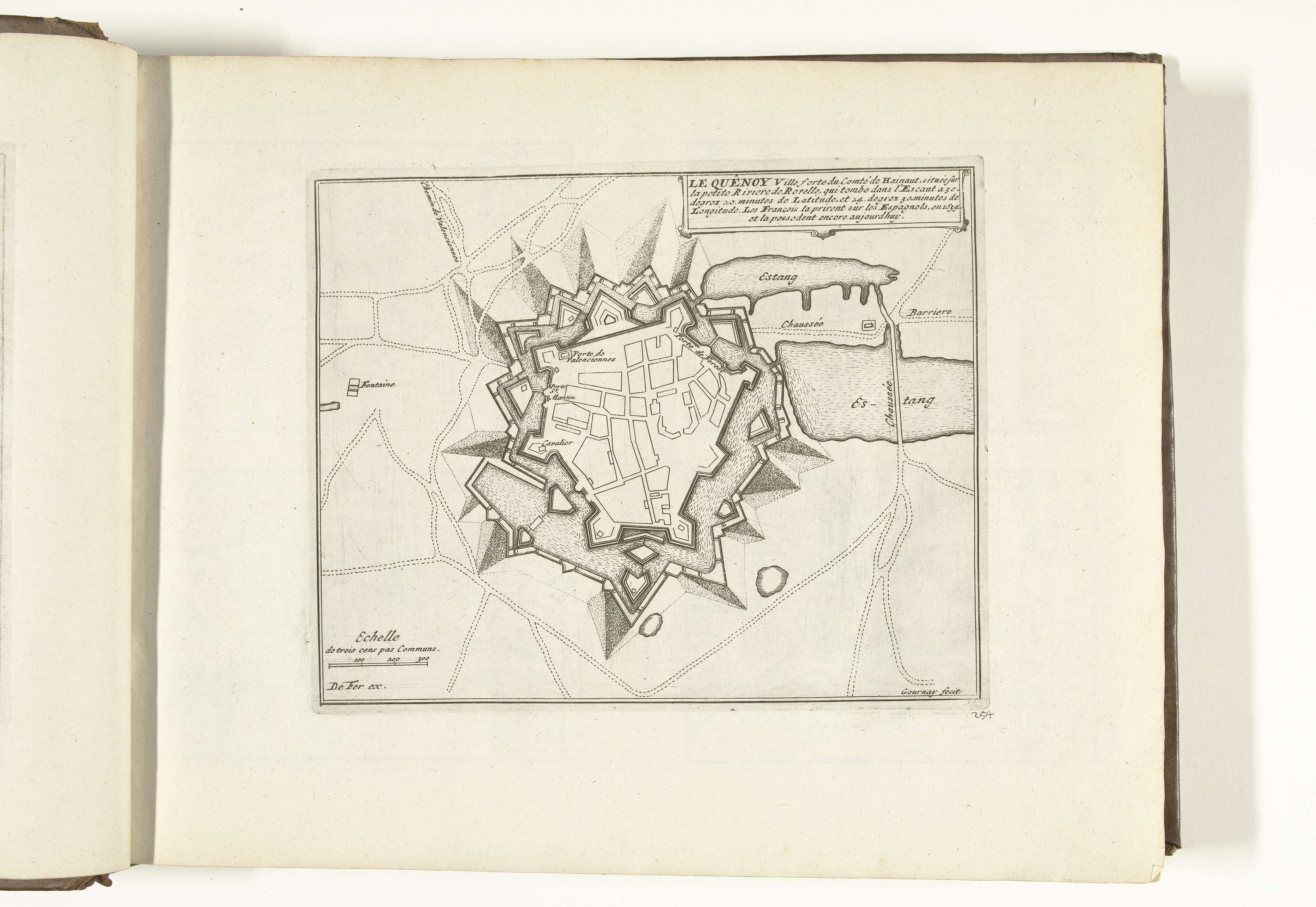 Plattegrond van de versterkingen om de stad le Quesnoy in de graafschap Henegouwen. Plaat nr. 254 in deel XI van het prentwerk: Les Forces de l'Europe, Asie, Afrique et Amerique ... Comme aussi les Cartes des Côtes de France et d'Espagne uit 1726, dit tweede deel met 271 met de hand genummerde platen van vermaarde ...